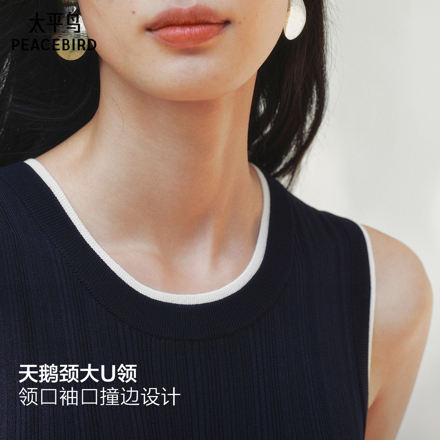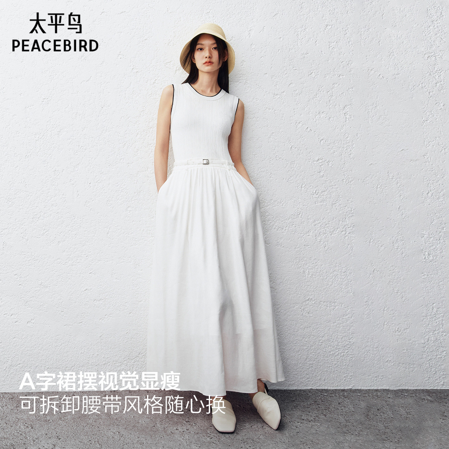 张婧仪同款 太平鸟大师蓝银边海岸商场亚麻无袖连衣长裙A1FAG2174
