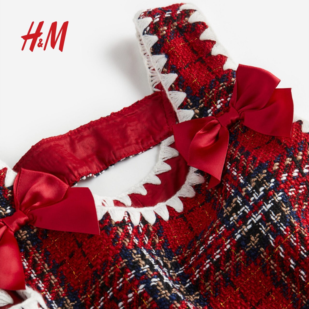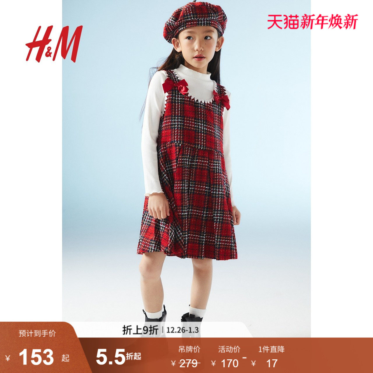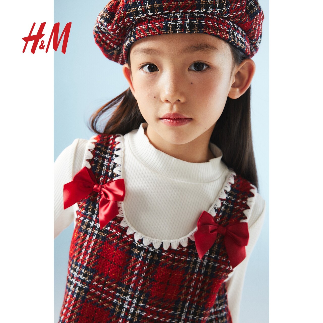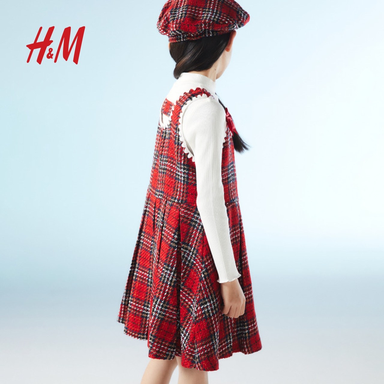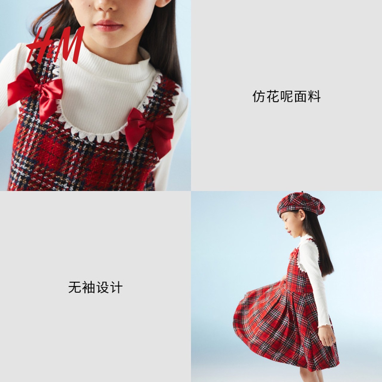 HM童装儿童女童连衣裙冬季蝴蝶结撞色格纹无袖红色背带裙1218948