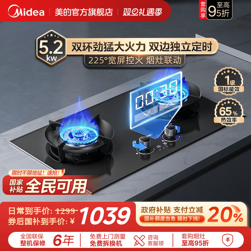 美的QD52定时智能防干烧燃气灶天然气灶煤气灶双灶家用嵌入式灶具