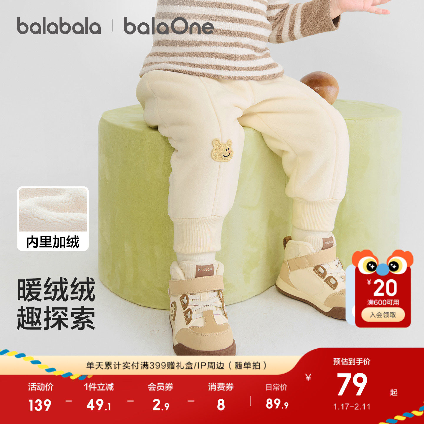巴拉巴拉童装宝宝长裤儿童加绒保暖裤2025新款冬装男童女造型萌趣
