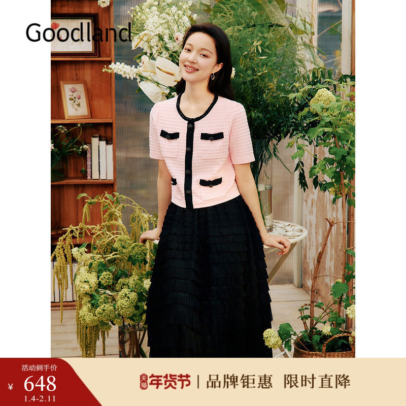 Goodland美地夏季A字压褶小黑裙网纱蛋糕半身裙