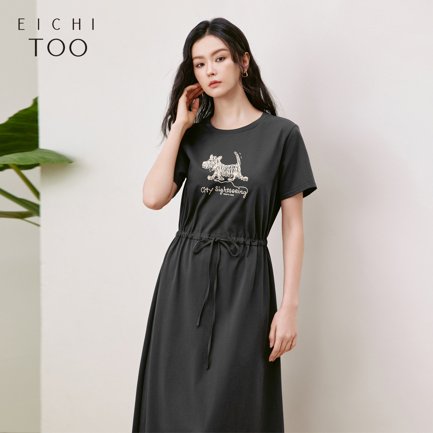 【热销补货】欧时力 褶皱短袖连衣裙女2026春新款收腰显瘦小黑裙