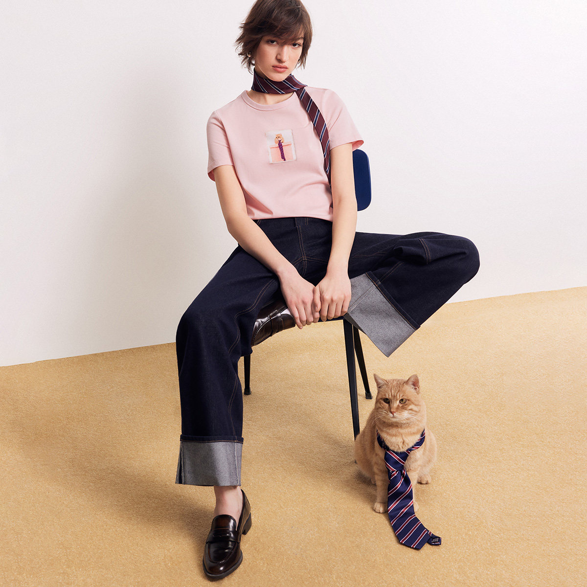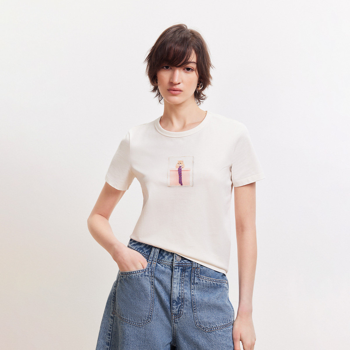 经典圆领双层包边,猫咪贴布印花
