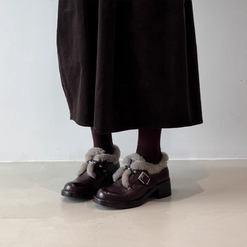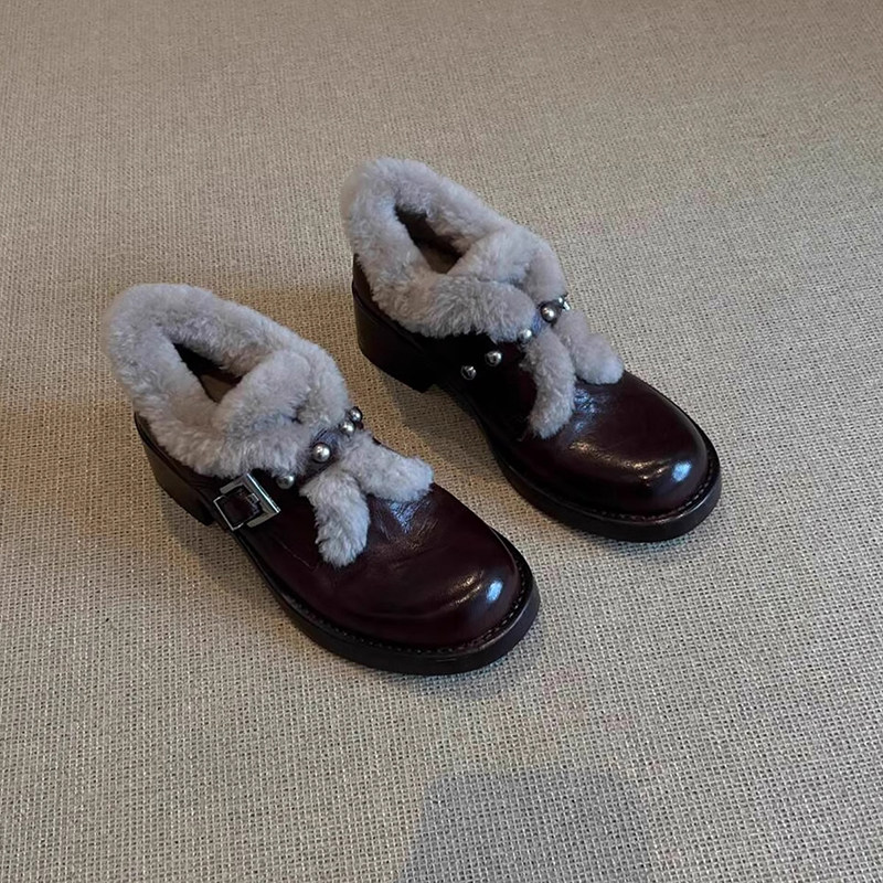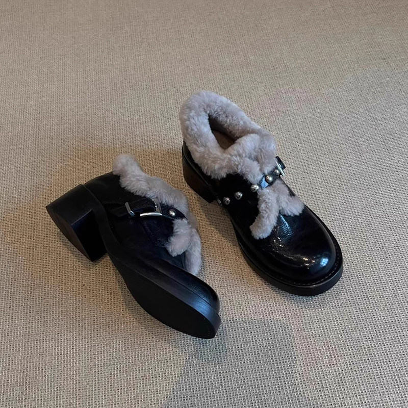 时尚英伦风粗跟加绒毛毛小皮鞋女2025秋冬新款百搭棕色小个子单鞋