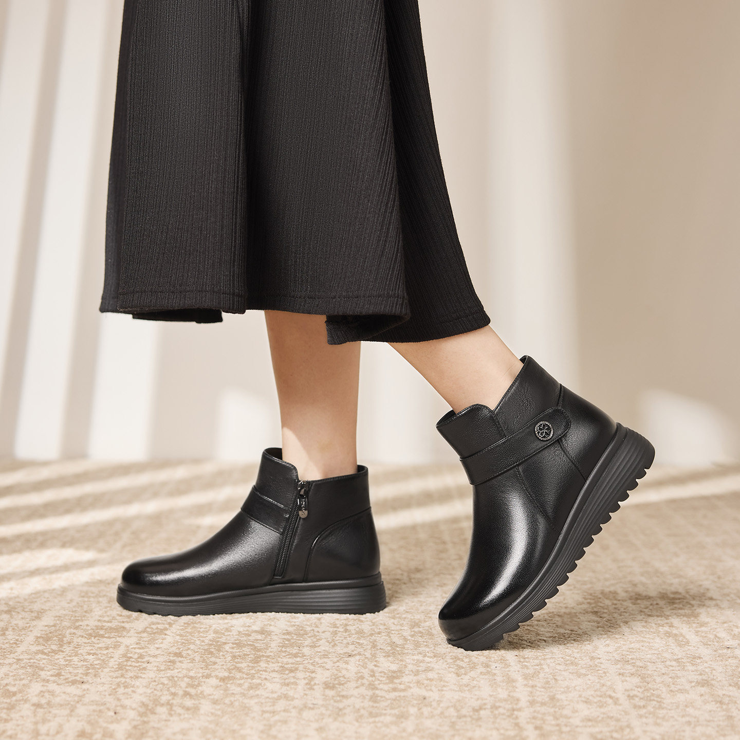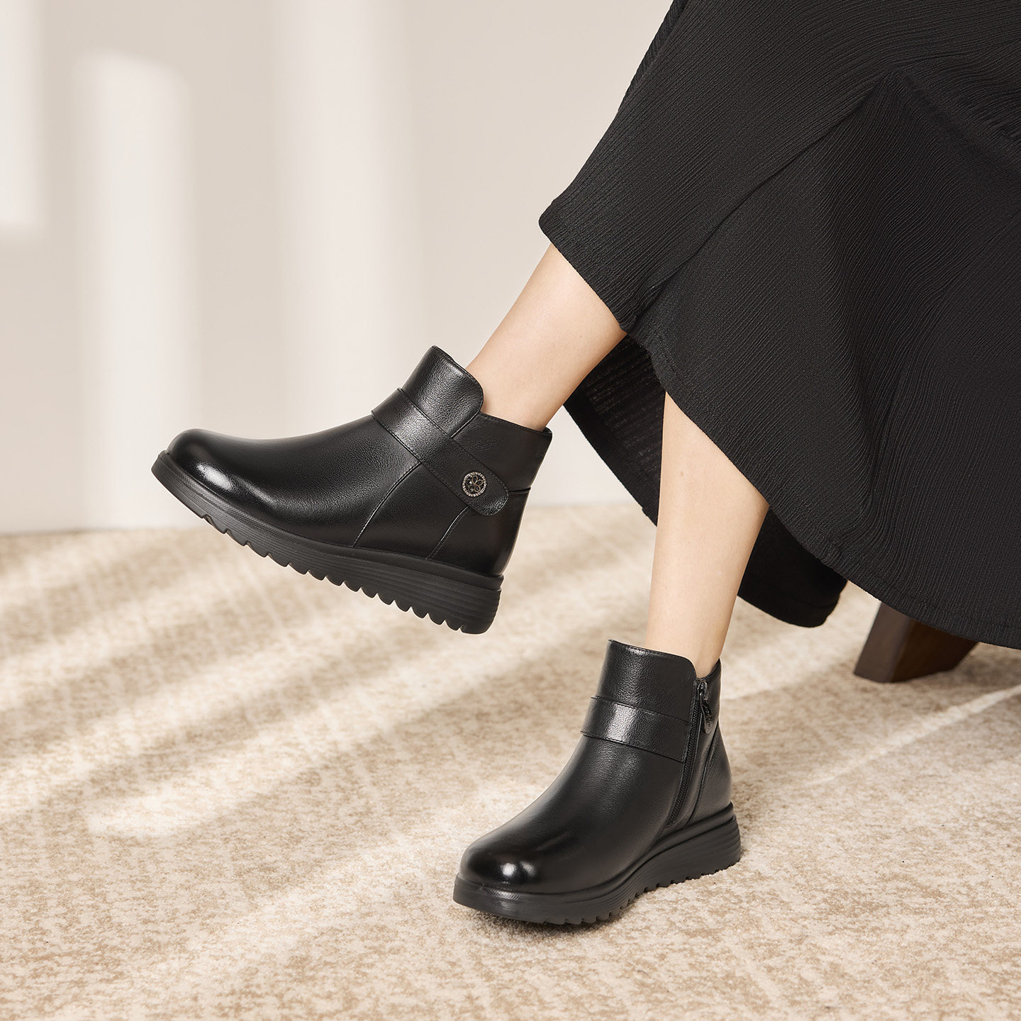 天美意厚底英伦奶皮靴加绒切尔西短靴女鞋子时装靴皮靴2025冬新款