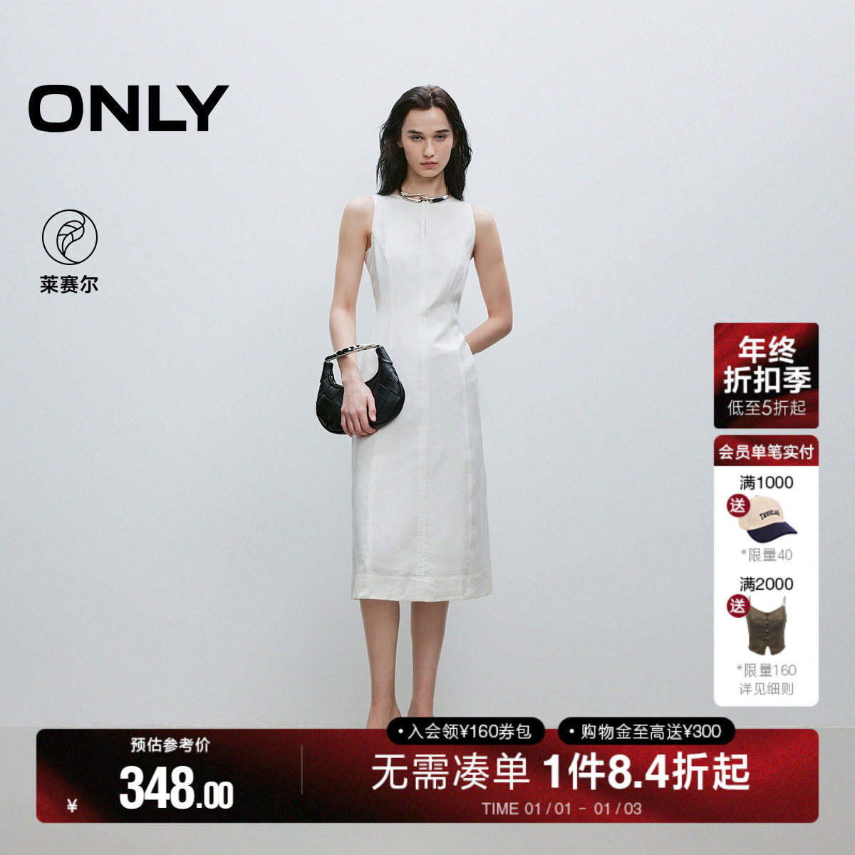 ONLY2025夏季新款淡人气质轻奢莱赛尔亚麻无袖白色中长裙连衣裙女