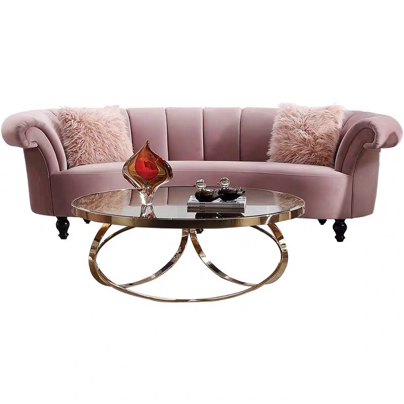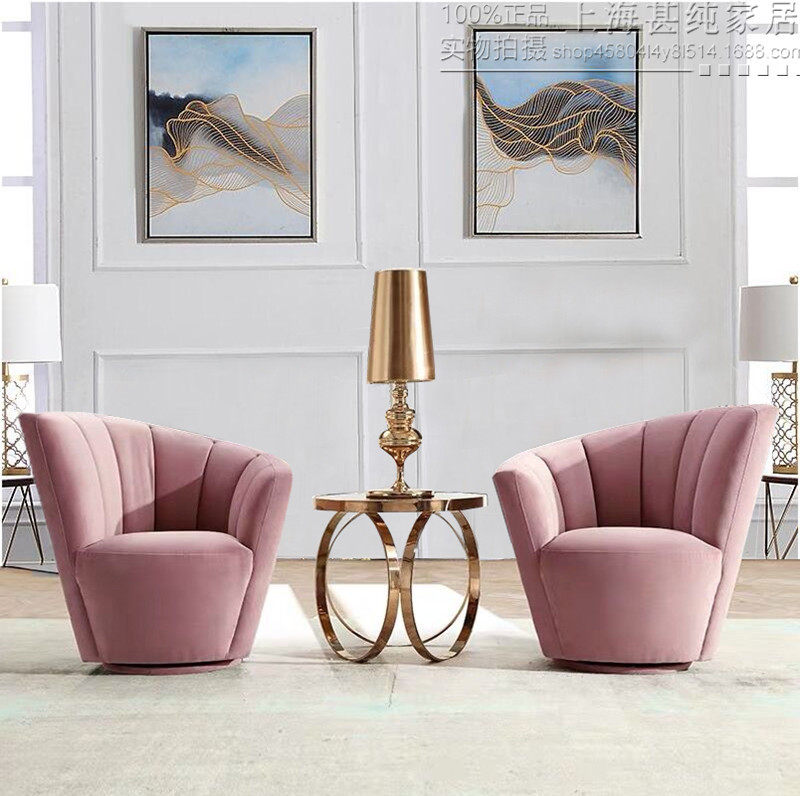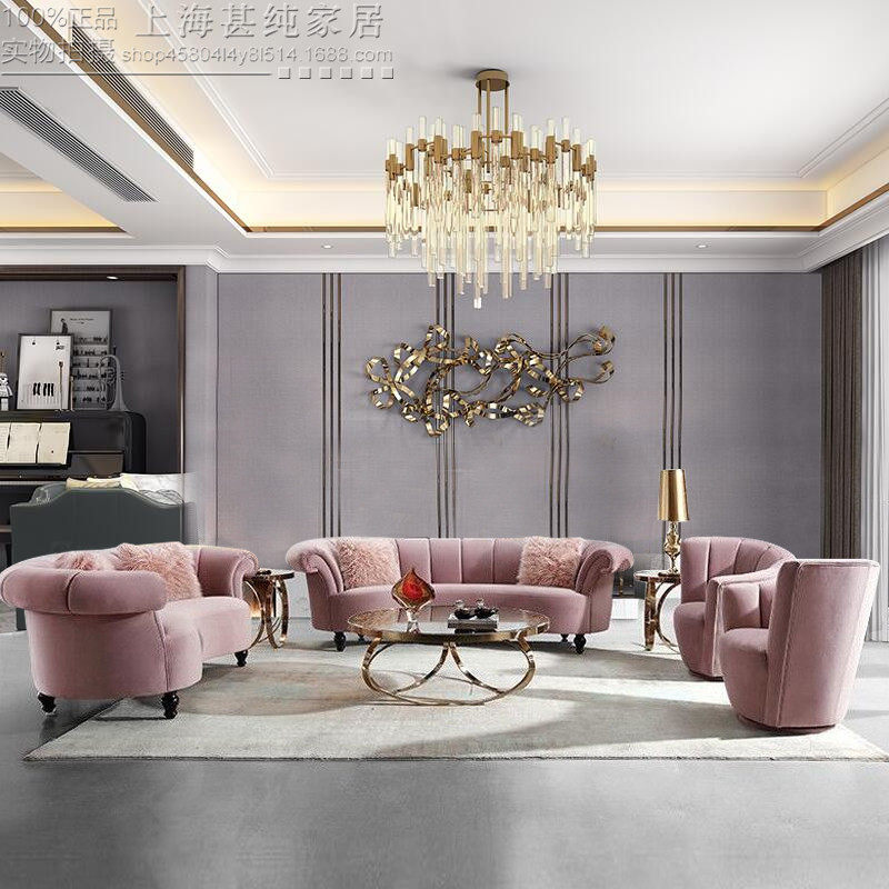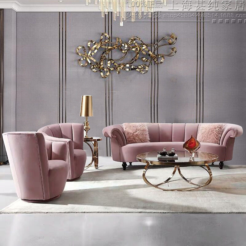 美式轻奢弧形三人沙发欧式客厅美容院样板房单双人粉色绒布艺沙发