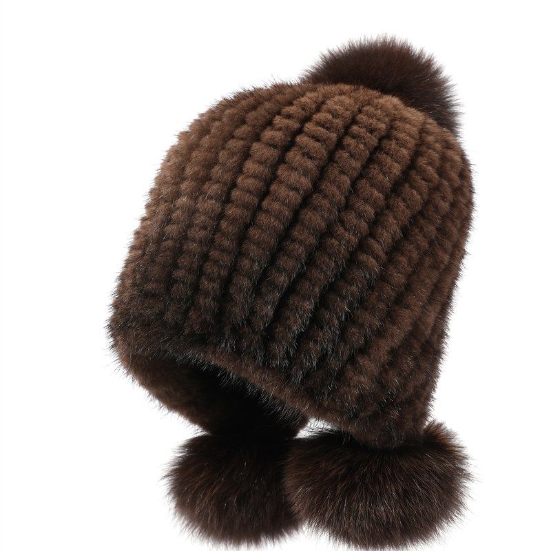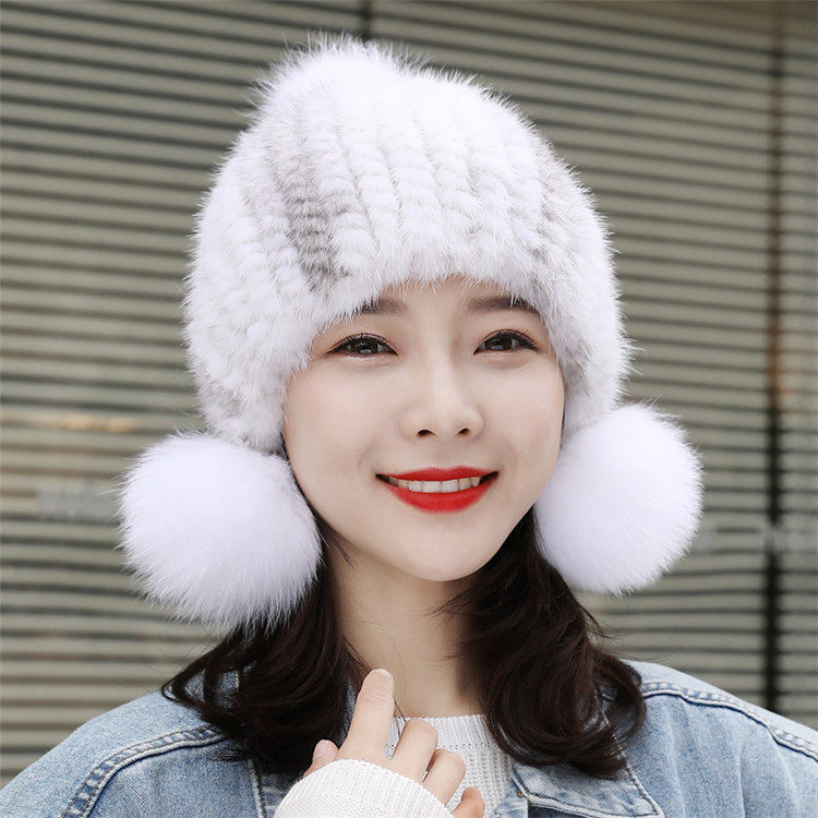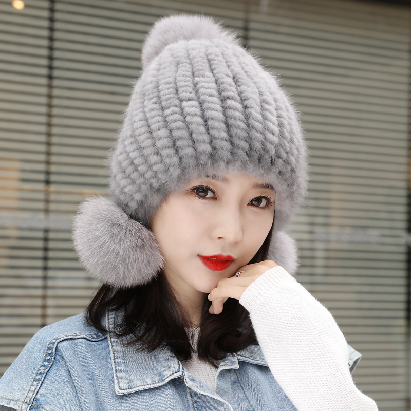 新款水貂皮草女帽子冬季貂毛编织女士狐狸毛球保暖护耳加厚冬天帽
