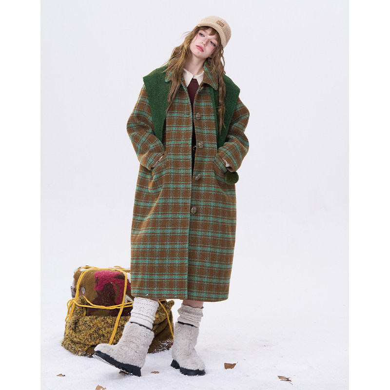 妖精的口袋复古格纹中长款毛呢外套女2025冬新款小个子学院风大衣