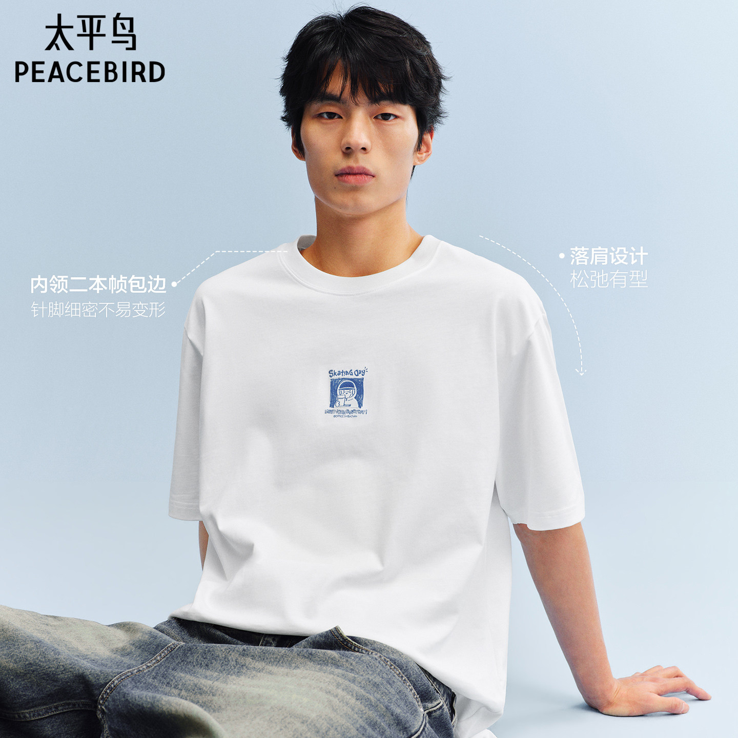 太平鸟男装 滑板小狗联名印花刺绣T恤