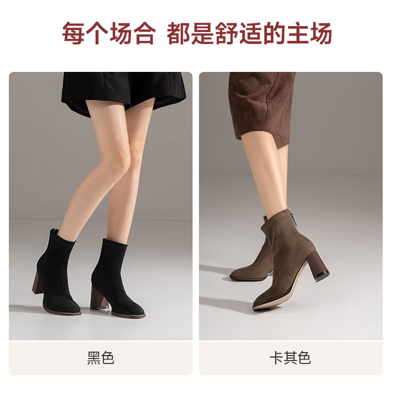 细跟高跟短靴子女2025年新款秋冬尖头绒面弹力瘦瘦靴显瘦中筒袜靴