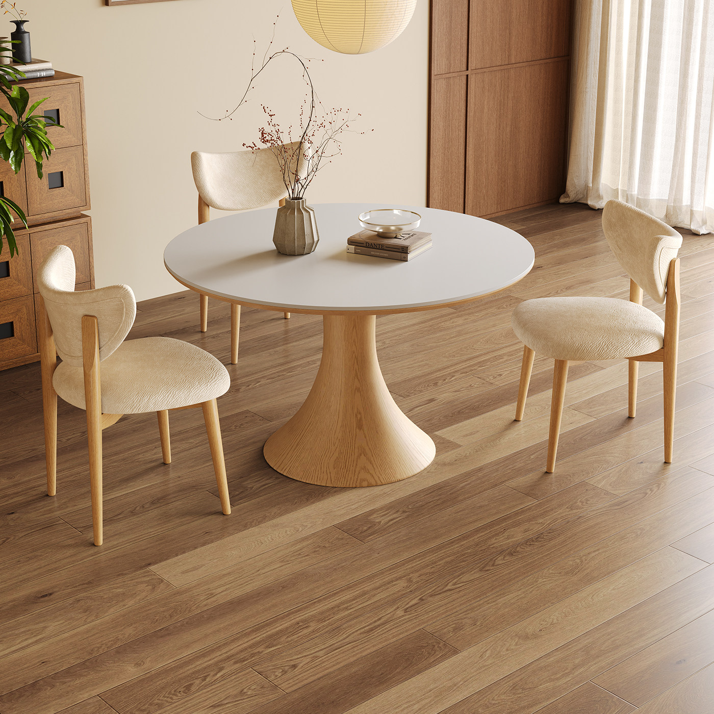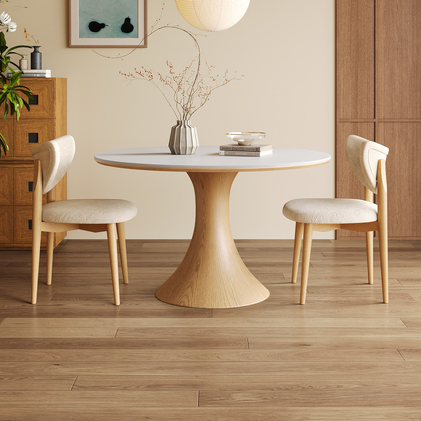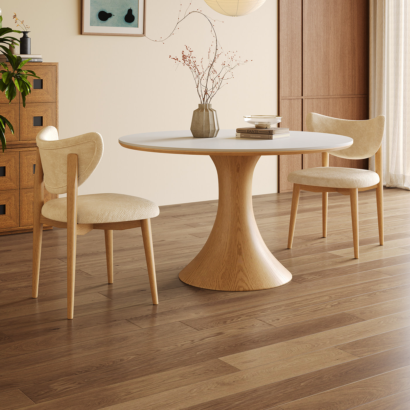 实木餐桌圆桌小户型原木奶油风2025新款哑光白色岩板餐桌椅组合
