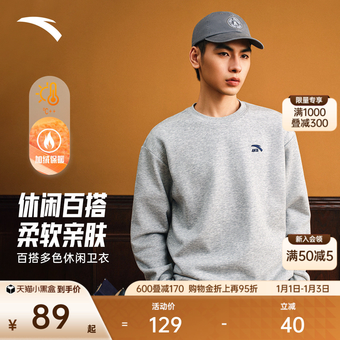 安踏加绒卫衣男保暖圆领套头衫男款2025冬季加厚宽松男士运动上衣