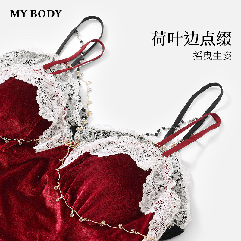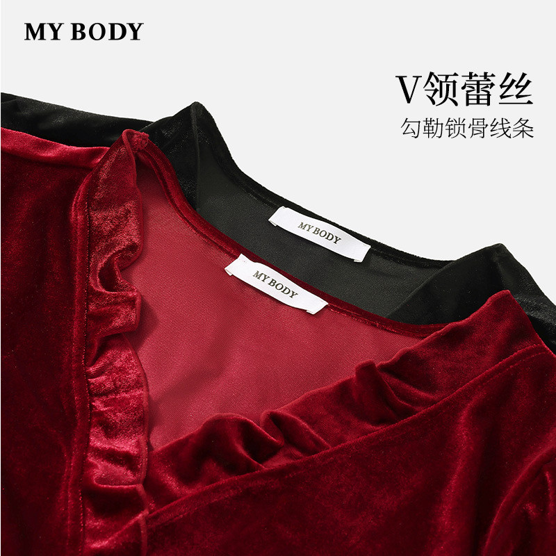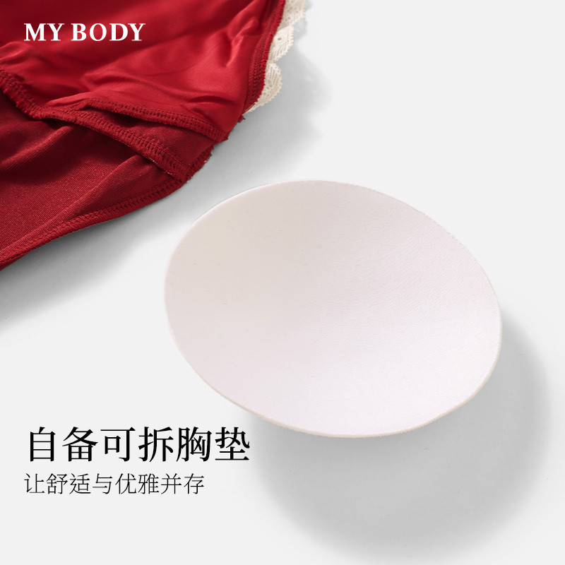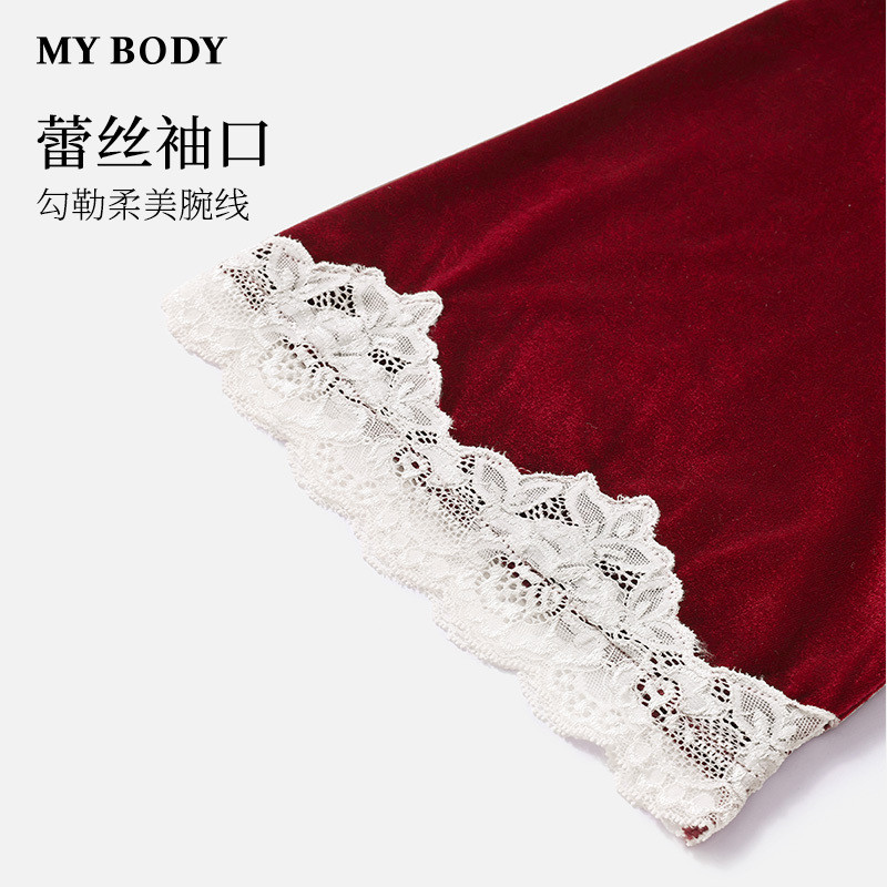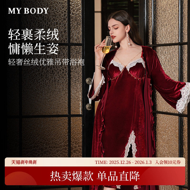 商场同款MYBODY秋季新款睡裙带胸垫V领蕾丝轻奢丝绒优雅吊带浴袍