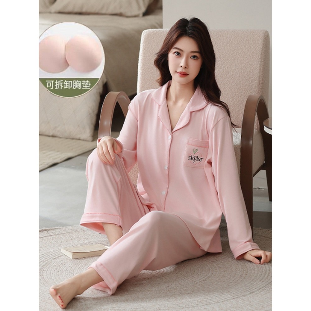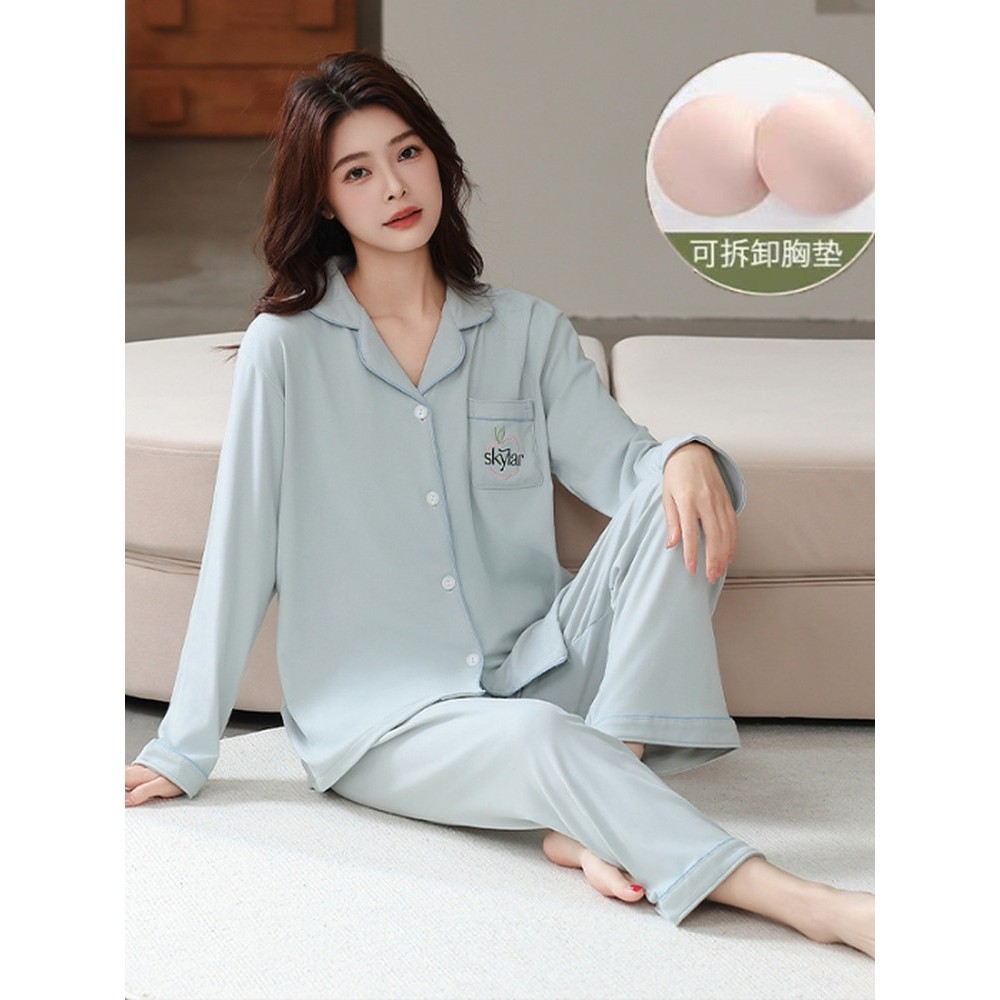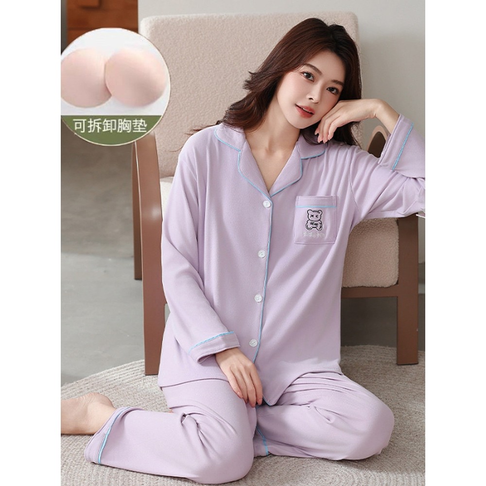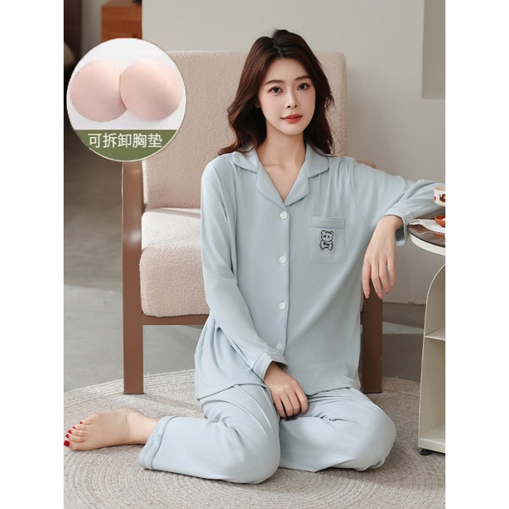 纯棉带胸垫睡衣女2025新款春秋季长袖套装可爱卡通韩版家居服秋冬
