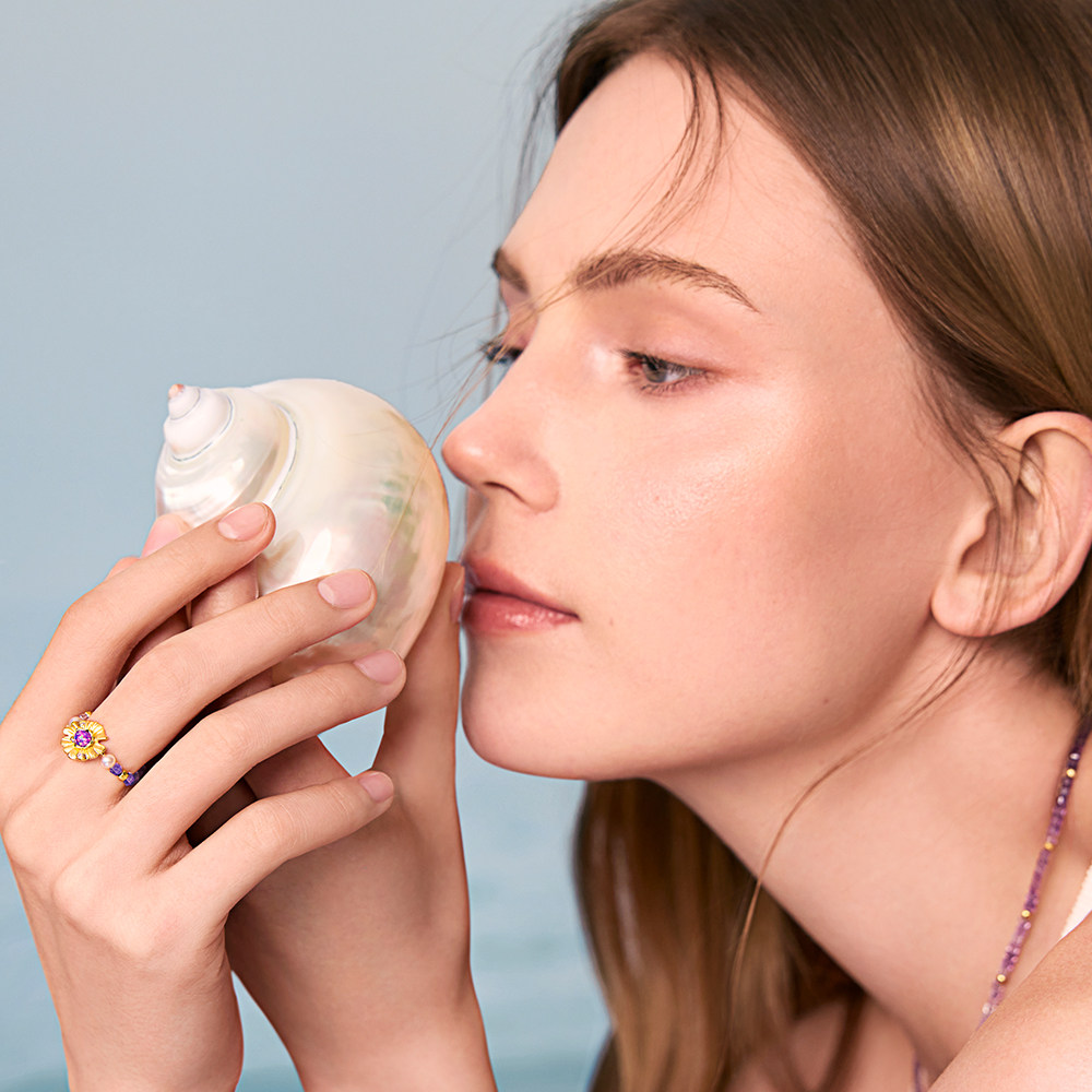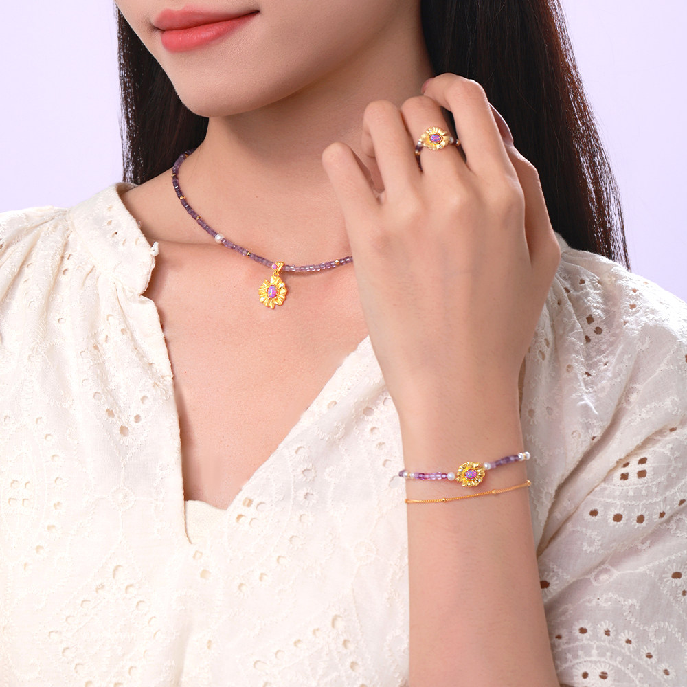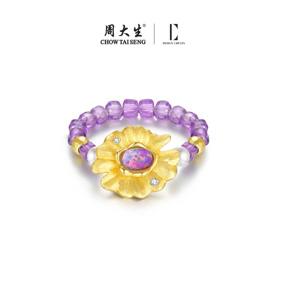 周大生*DC梦幻睡莲紫水晶戒指纯银法式珍珠食指戒生日礼物送女友