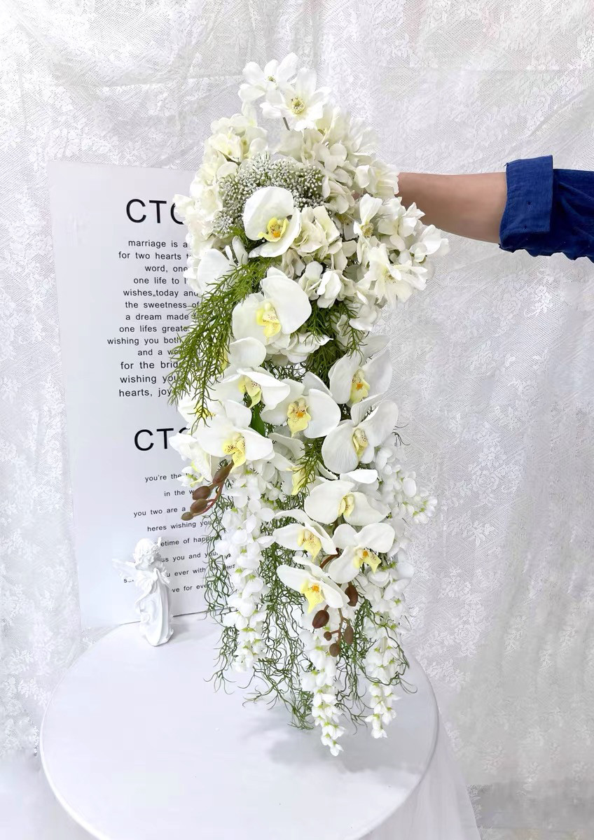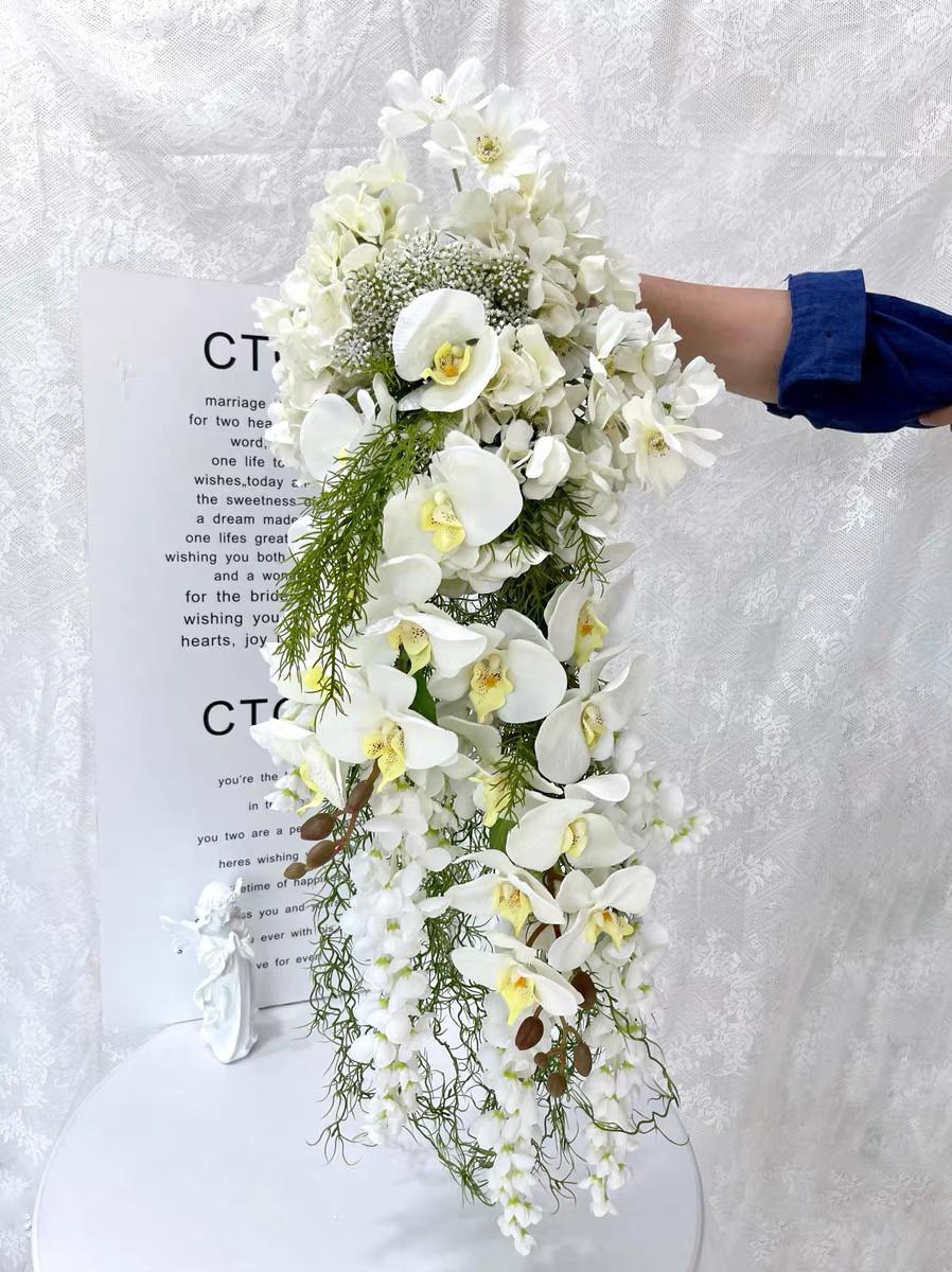 高级复古婚礼白色仿真花瀑布款手捧花新娘领证结婚花束拍照道具