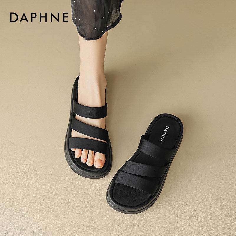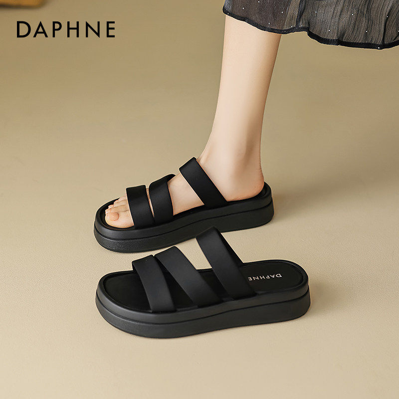 达芙妮黑色厚底拖鞋女2026新款夏季外穿海边凉鞋平底舒适懒人凉拖