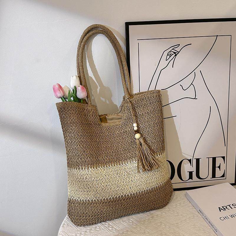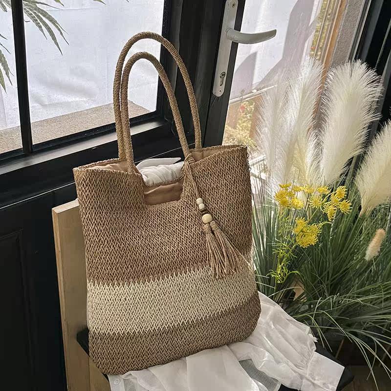 2024新款编织包时尚流苏单肩草编包休闲大容量拼色条纹女包沙滩包