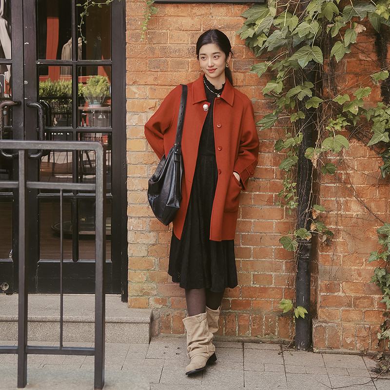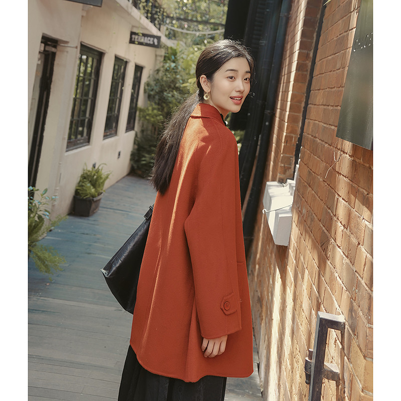水沐飞高级感酒红色双面羊绒大翻领毛呢大衣女秋冬中长款羊毛外套