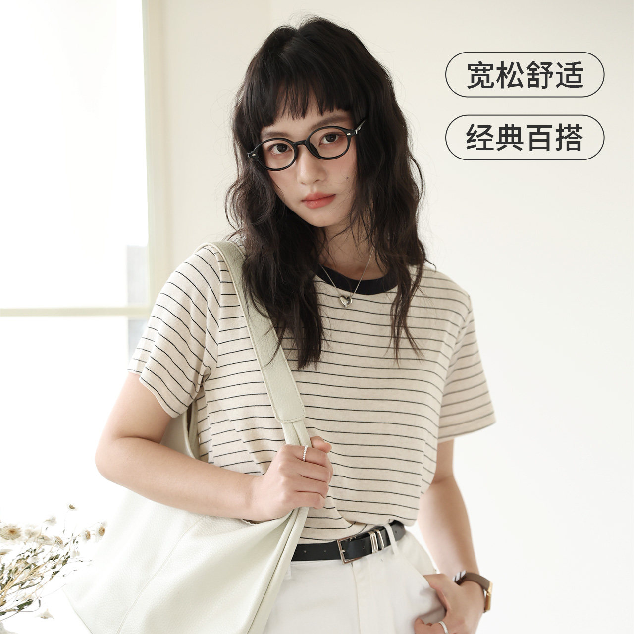 caramella2026夏季新款简约亚麻棉短袖T恤女轻薄透气条纹撞色上衣