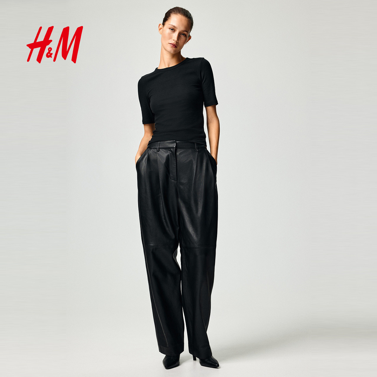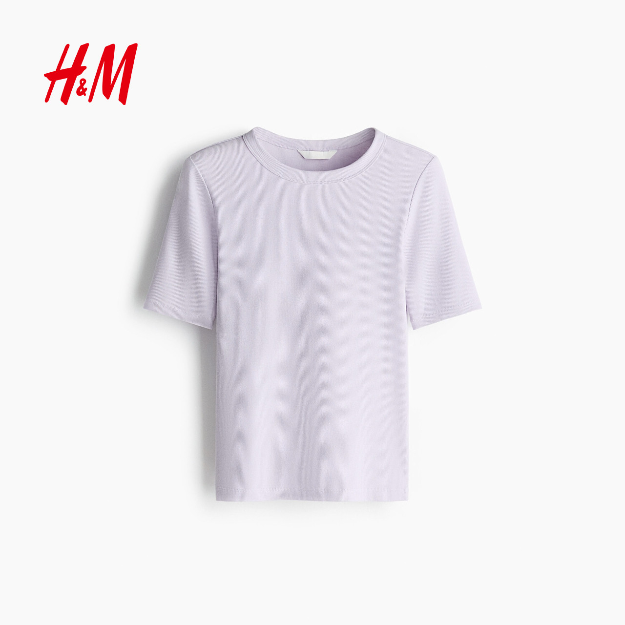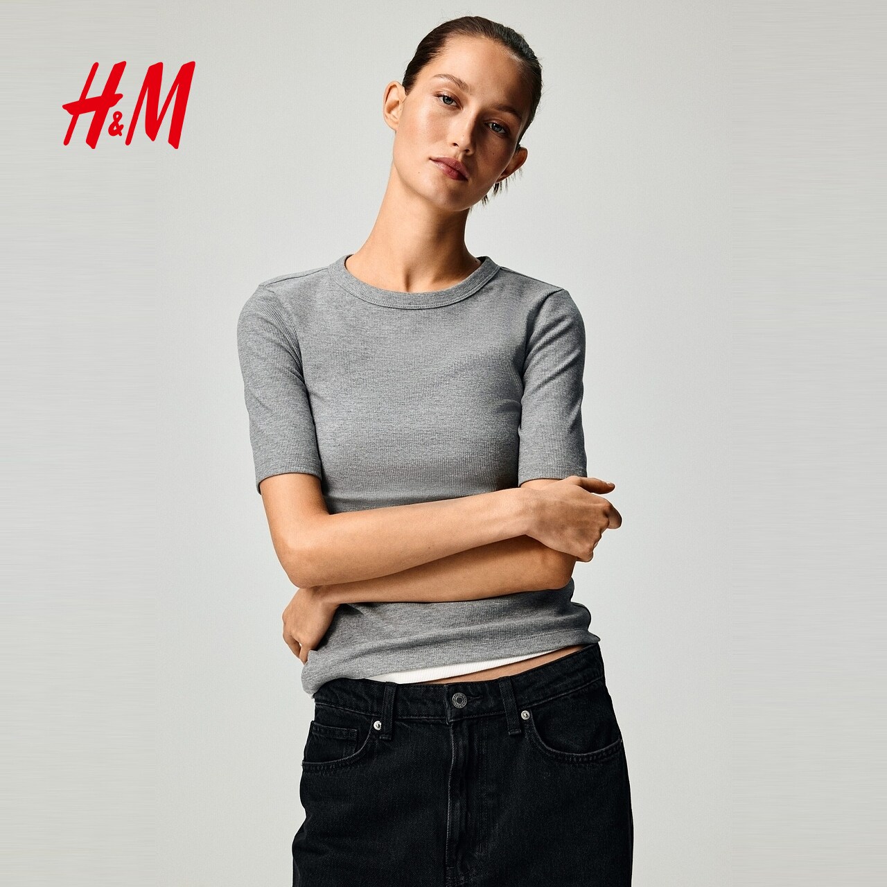 HM女装T恤2026春季新款罗纹圆领户外出游时尚气质简约上衣1323017
