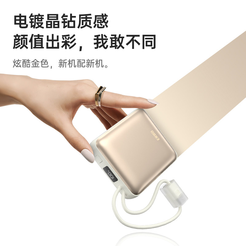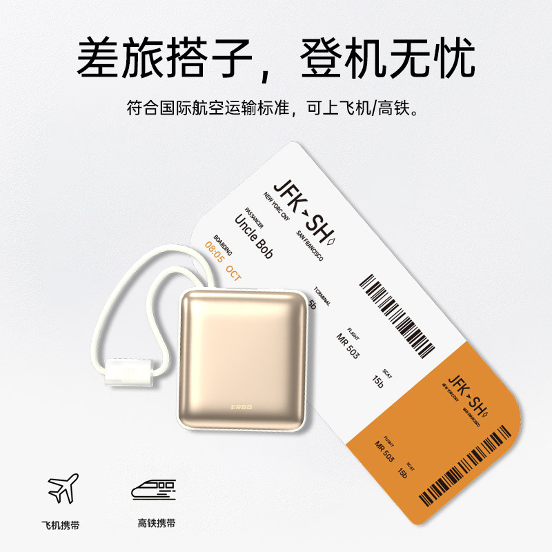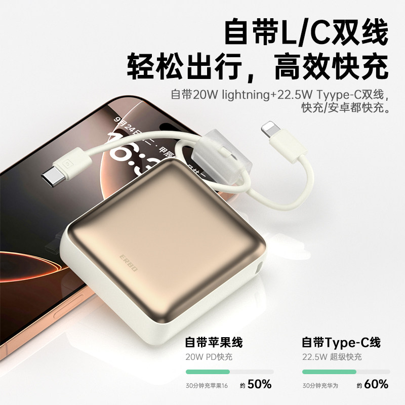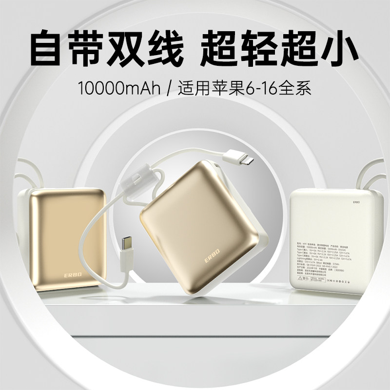 二伯小方块充电宝2025新款快充小巧超薄便携自带线10000毫安大容量适用苹果16华为16pro移动电源飞机可携带