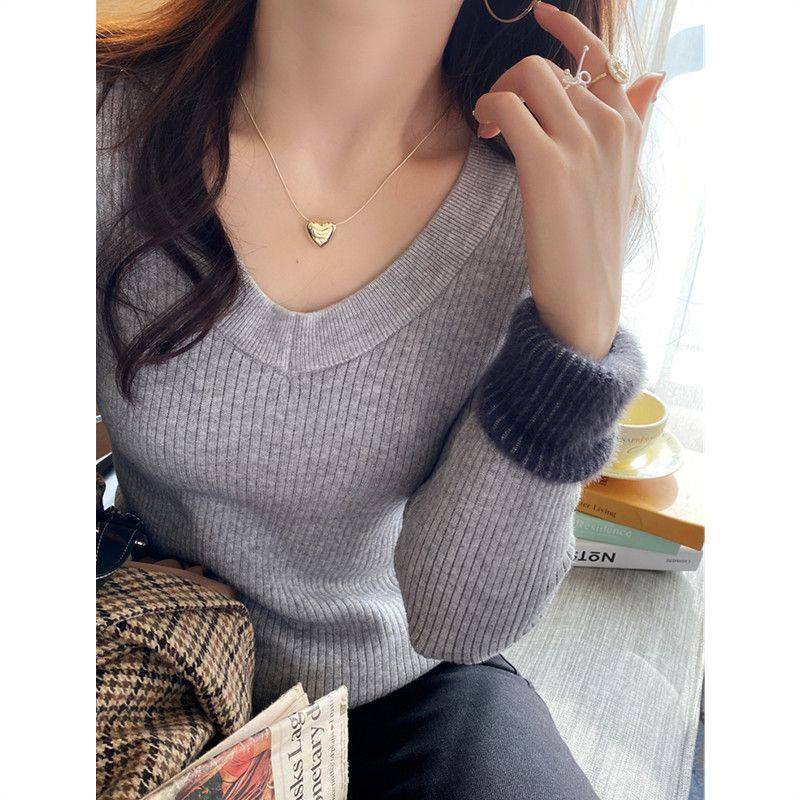 加绒加厚低领打底衫女款大码内搭秋冬季保暖白色V领毛衣针织上衣