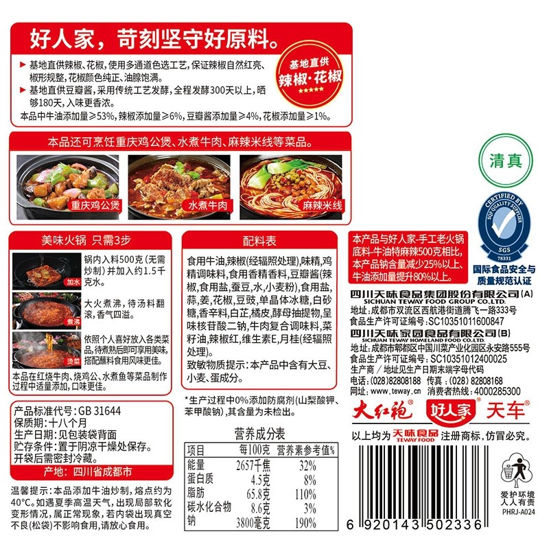 好人家牛油火锅底料400g手工火锅料500g麻辣调料清真牛肉配方水煮