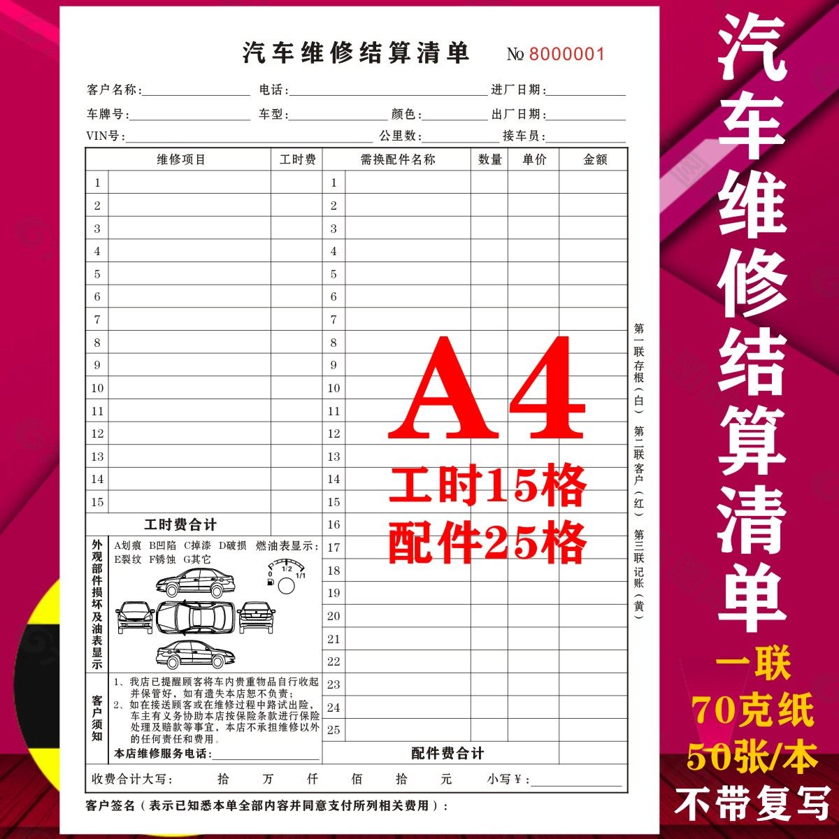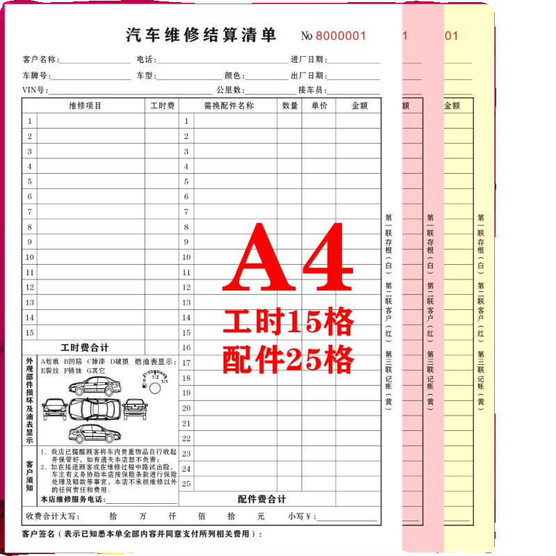 汽车修理厂维修保养服务专用收据三联汽修厂车辆清洗美容收款单据