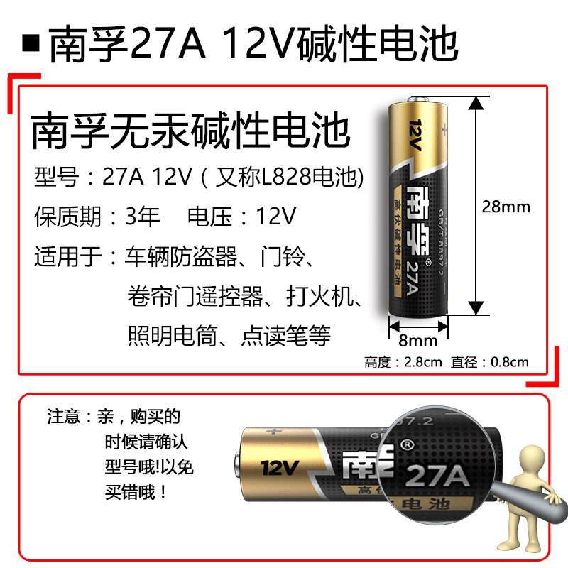 南孚电池12v27a防盗报警器车库闸门遥控器a27s小号碱性l828卷帘门