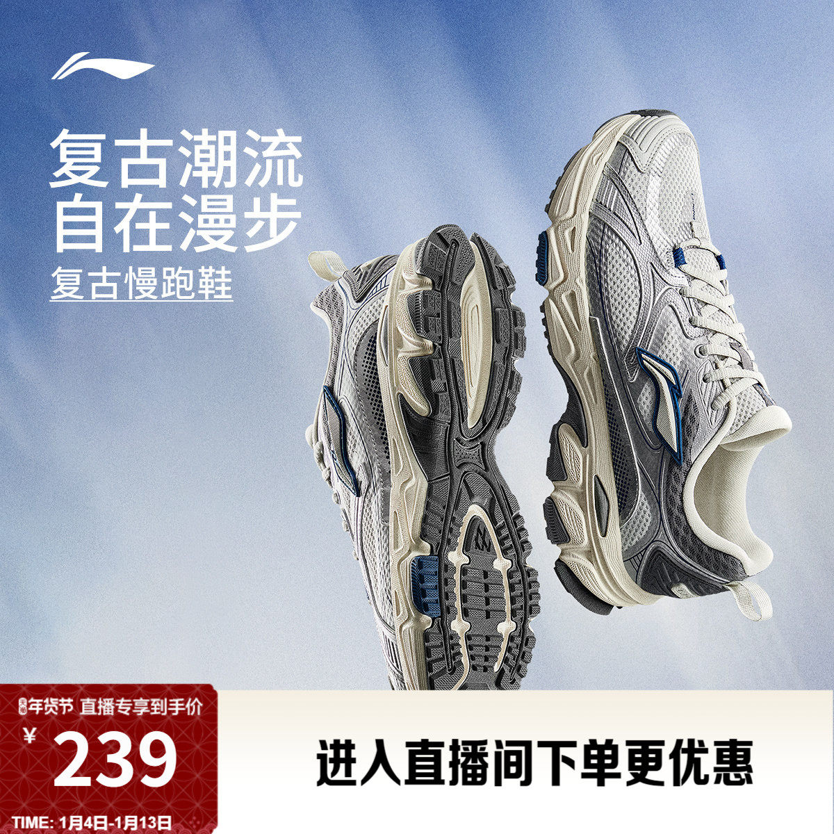 李宁逍遥丨跑步鞋男新款百搭复古潮流减震轻便透气旅游休闲运动鞋