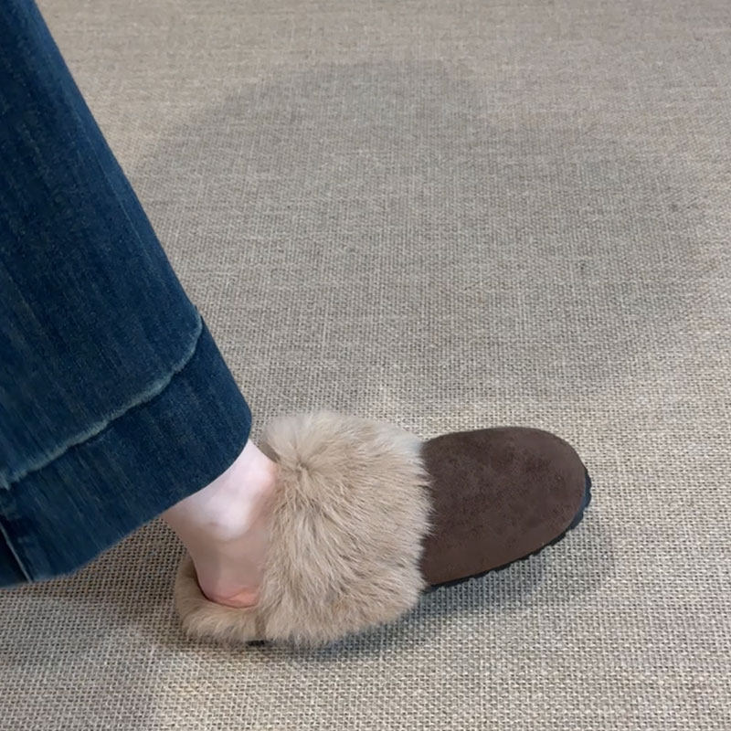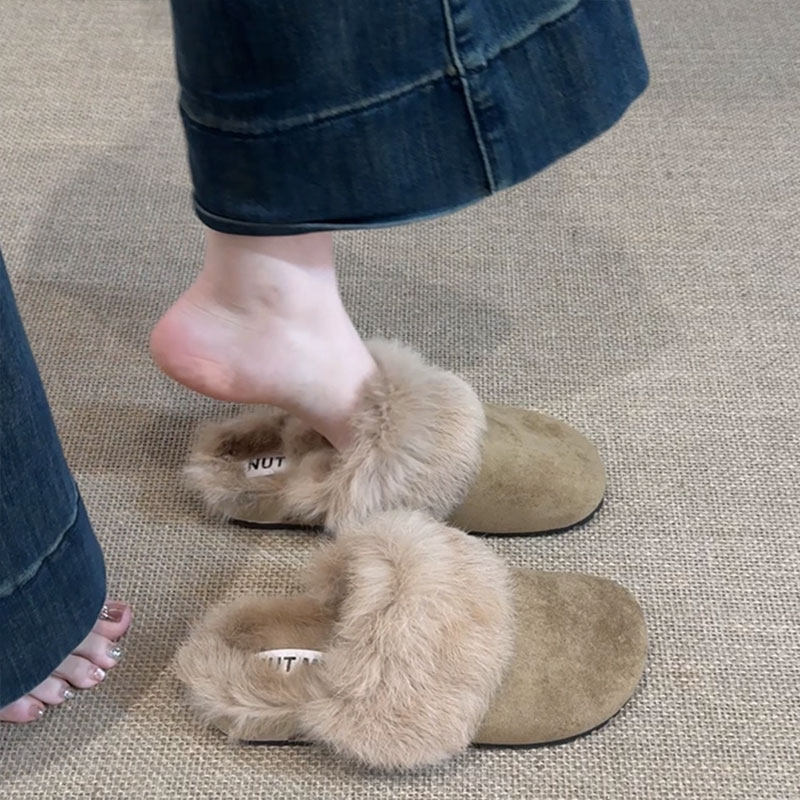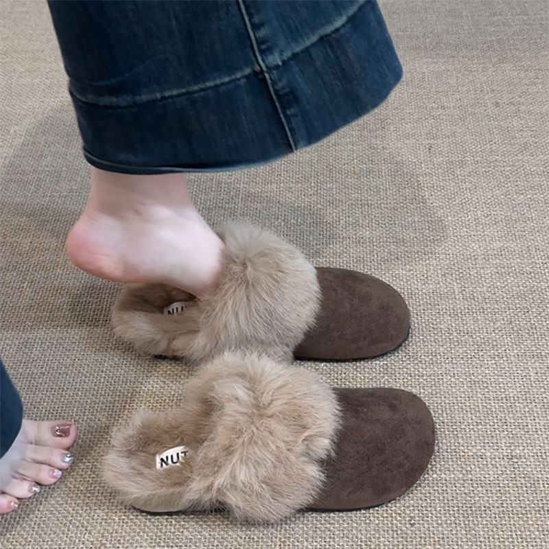 时尚部落平底加绒包头半拖鞋女外穿2025冬季新款毛毛棉拖雪地靴女