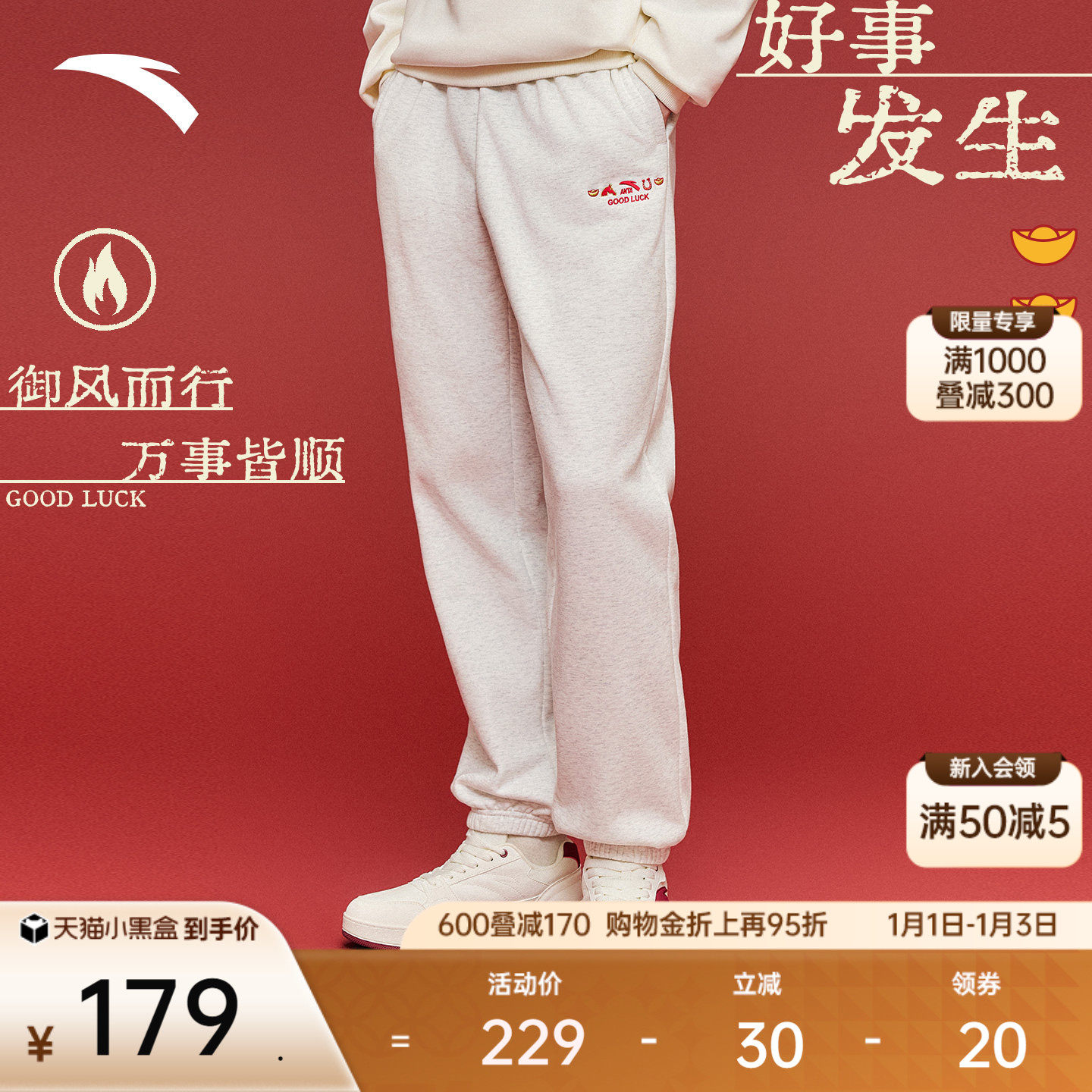 安踏好事发生丨“有钱花”加绒运动卫裤男士冬宽松休闲束脚长裤子