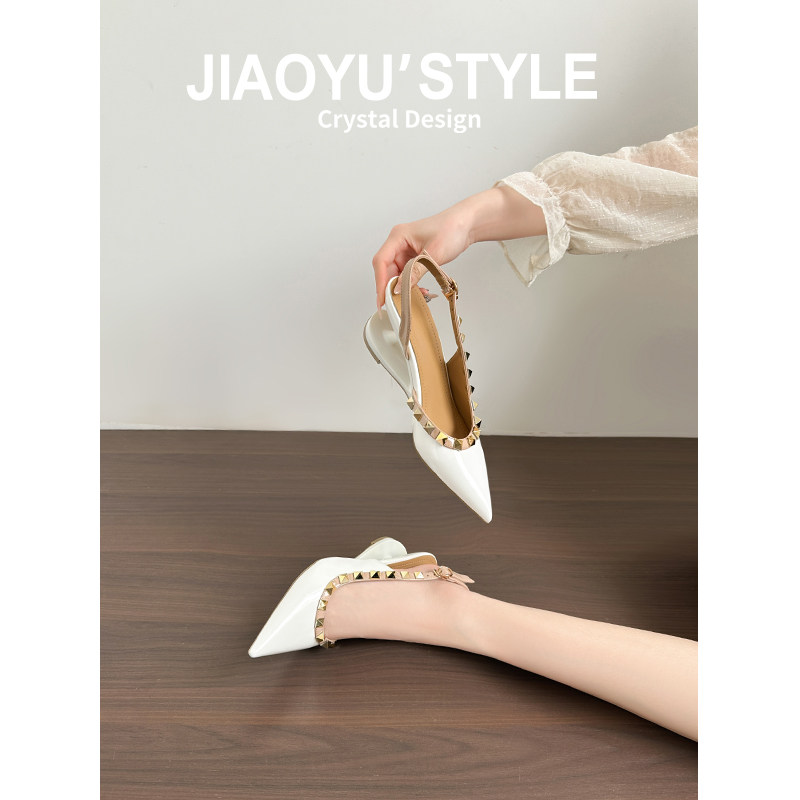 真皮~骄屿裸粉色包头凉鞋2026新款法式尖头浅口一字带铆钉高跟鞋