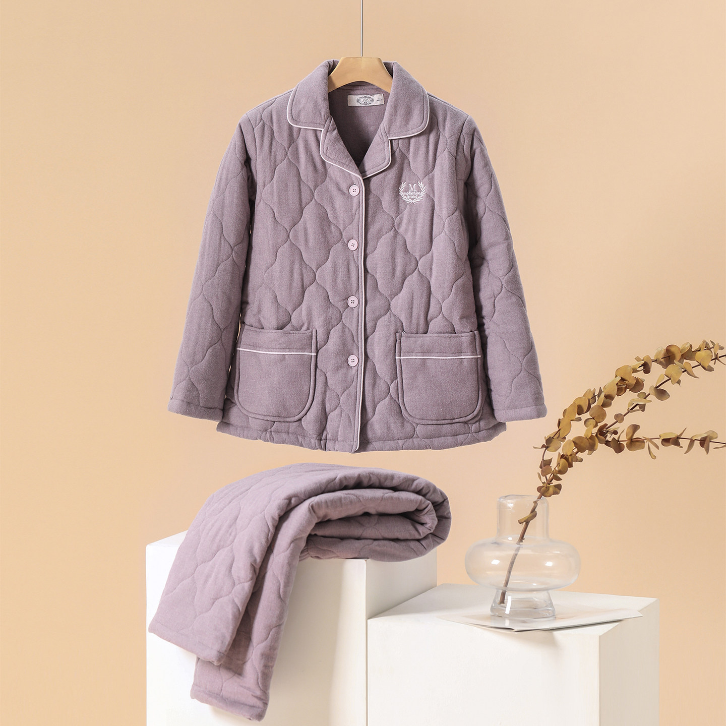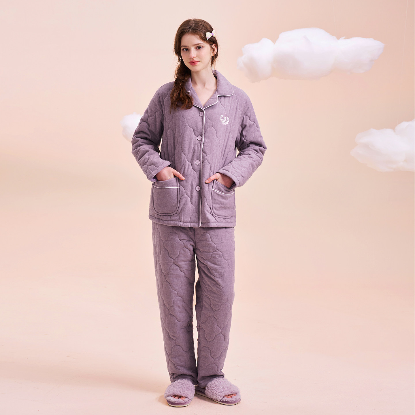 美标新款情侣三层夹棉睡衣套装女秋冬加厚纯棉休闲全棉质家居服男