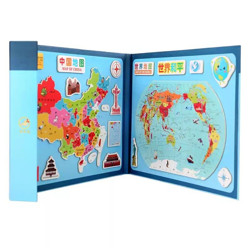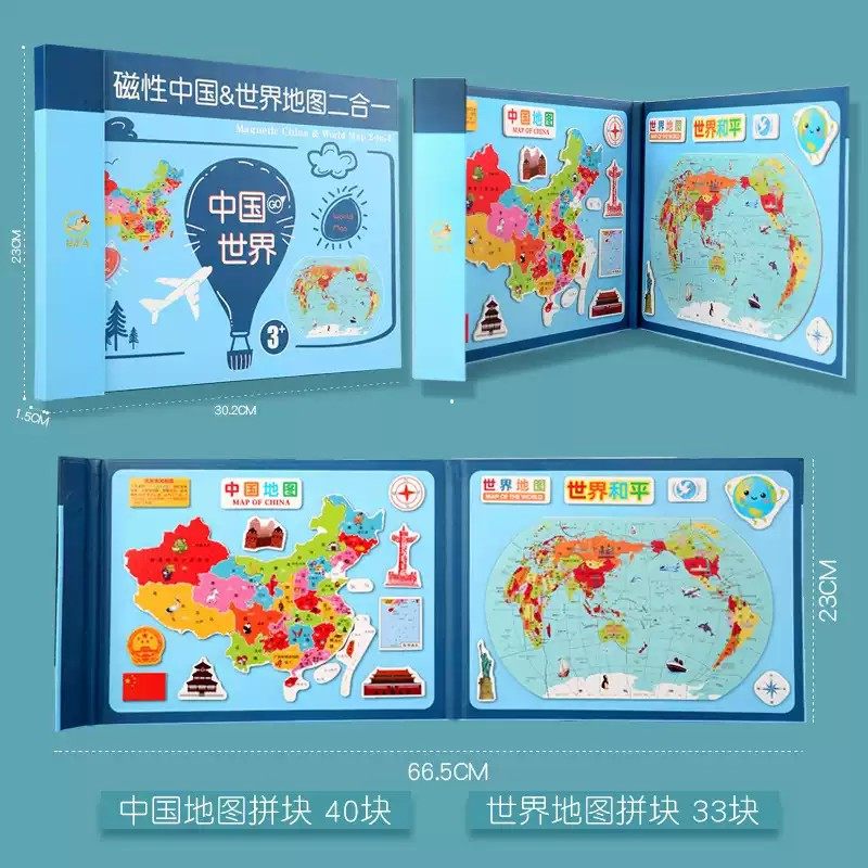 磁性书本式中国世界二合一地图拼图儿童益智拼板玩具地理认知智力