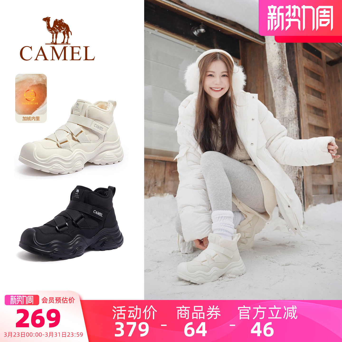 骆驼女鞋2025冬季新款厚底丑萌雪地靴女款加绒保暖棉鞋户外登山鞋