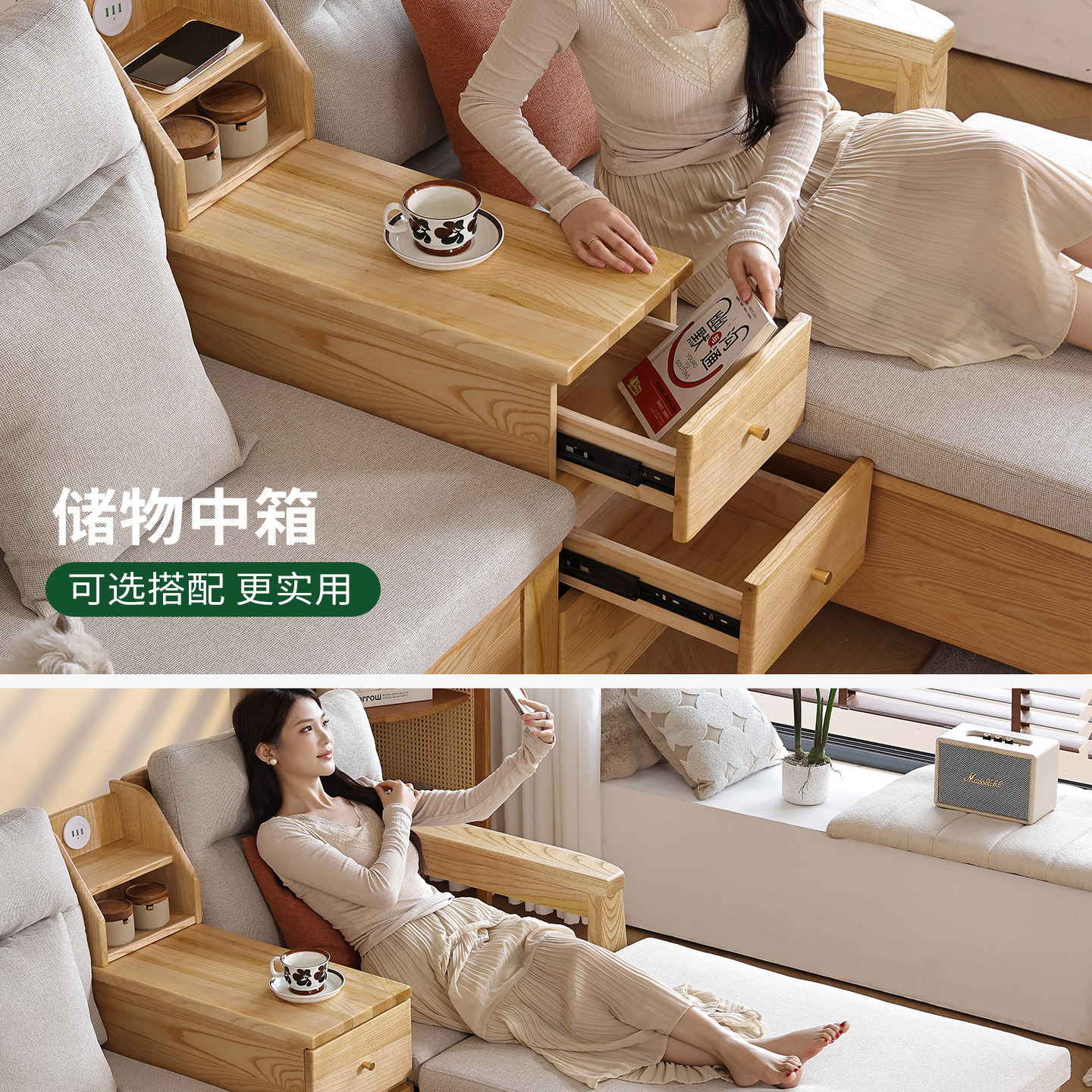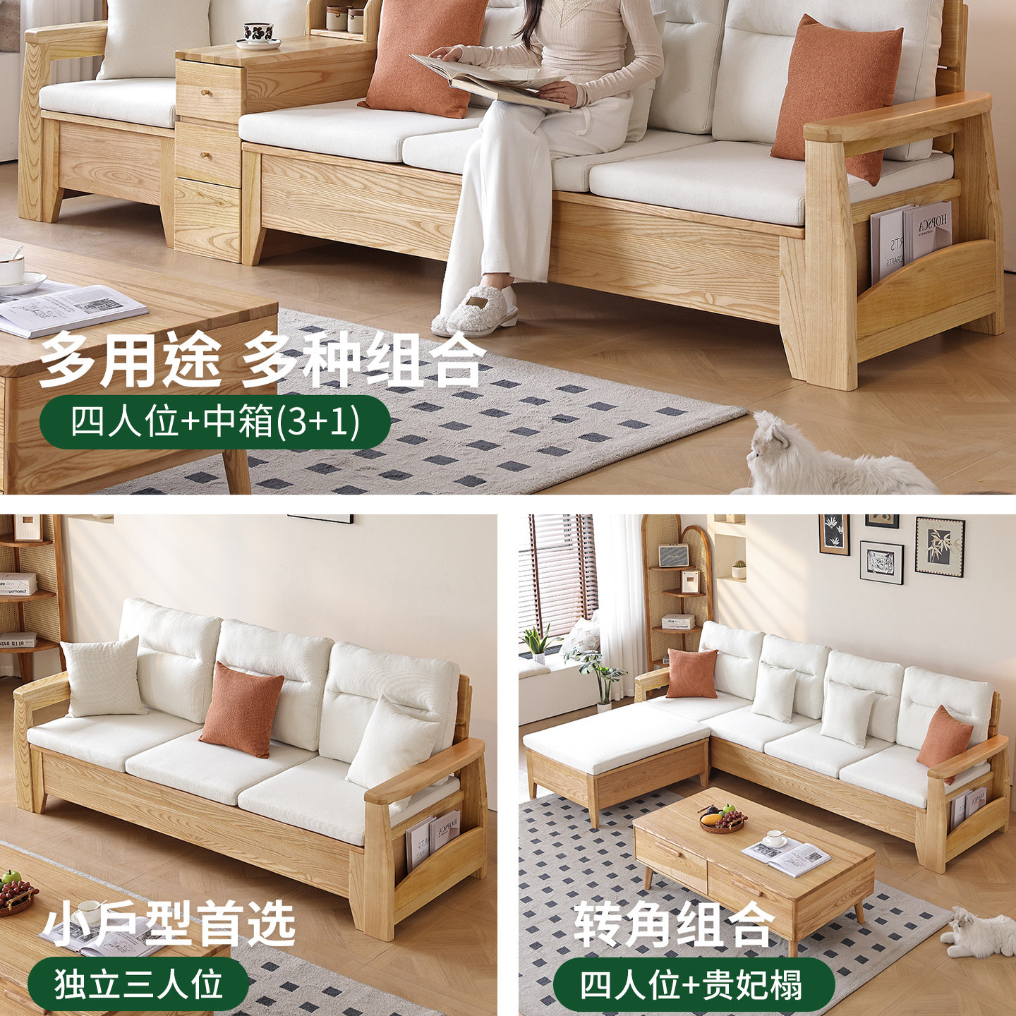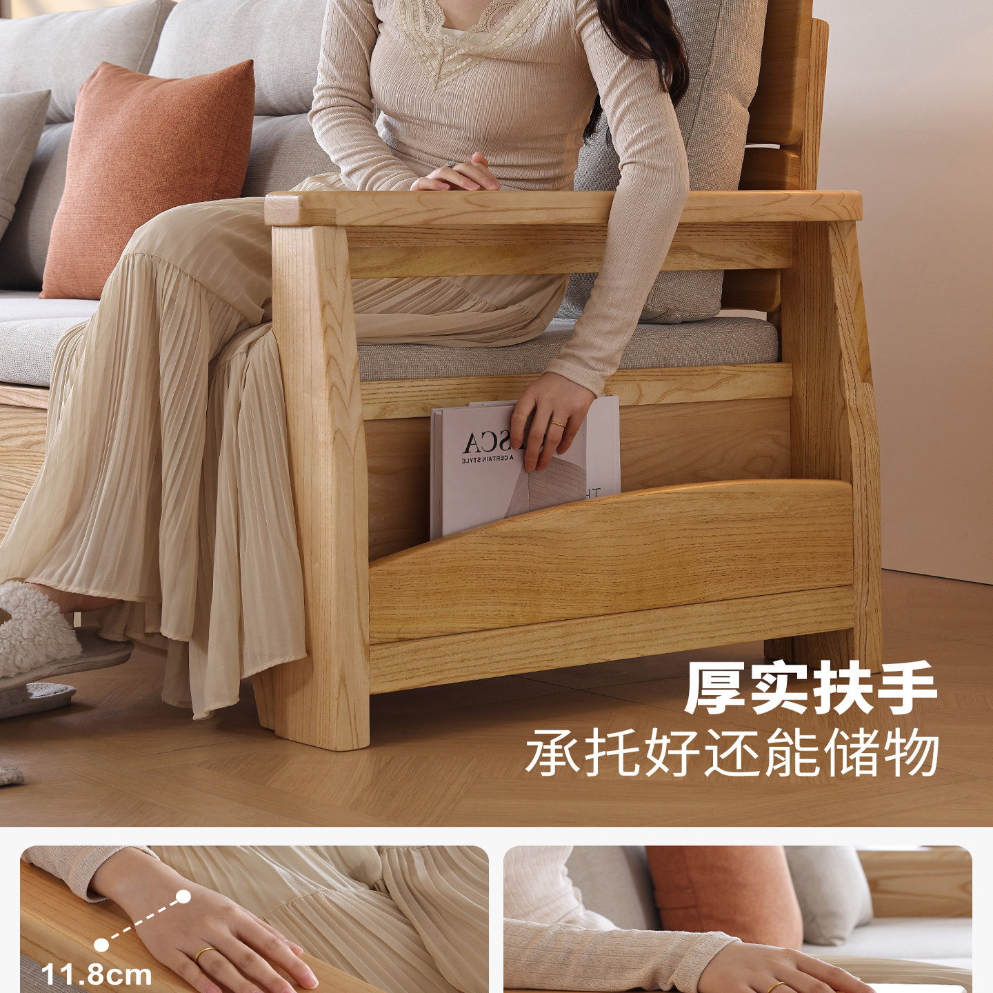 一林半舍白蜡木纯实木沙发小户型客厅北欧原木风布艺直排储物沙发