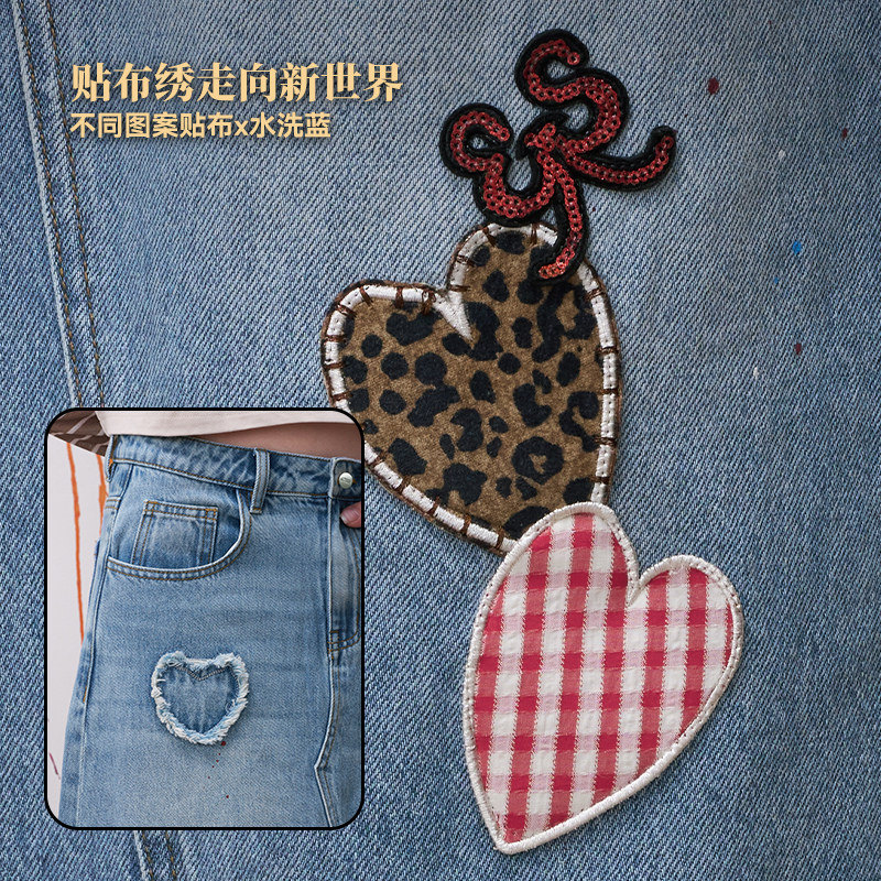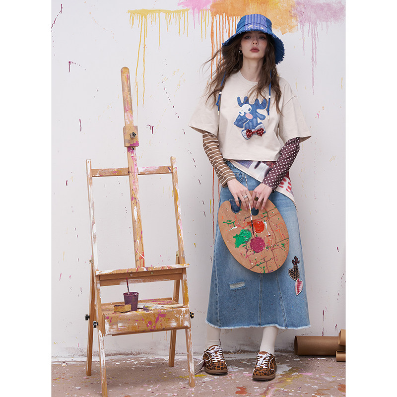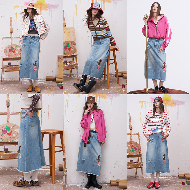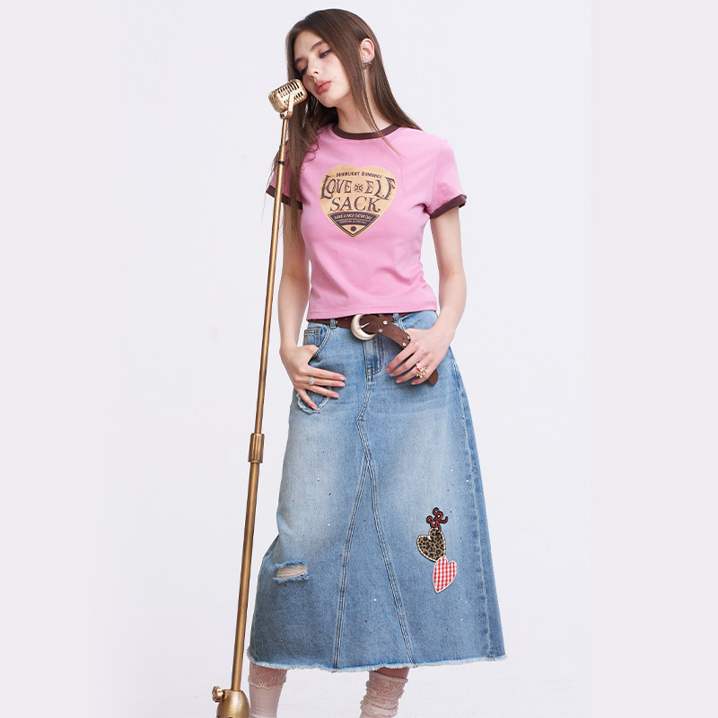 妖精的口袋毛边爱心a字半身裙女2026春夏新款高腰破洞牛仔裙长裙
