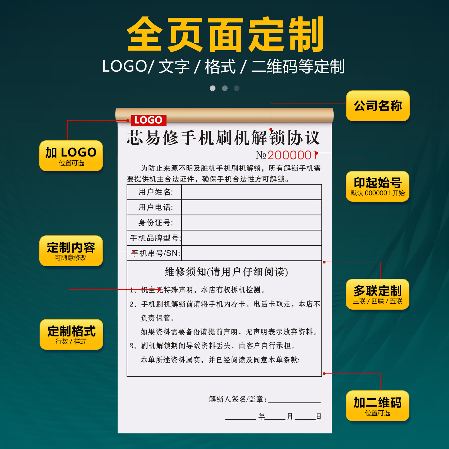 【手机刷机售后服务协议】维修换屏解锁开锁修理受理单二手手机回收登记表修手机保修报修合同维修保证收据本