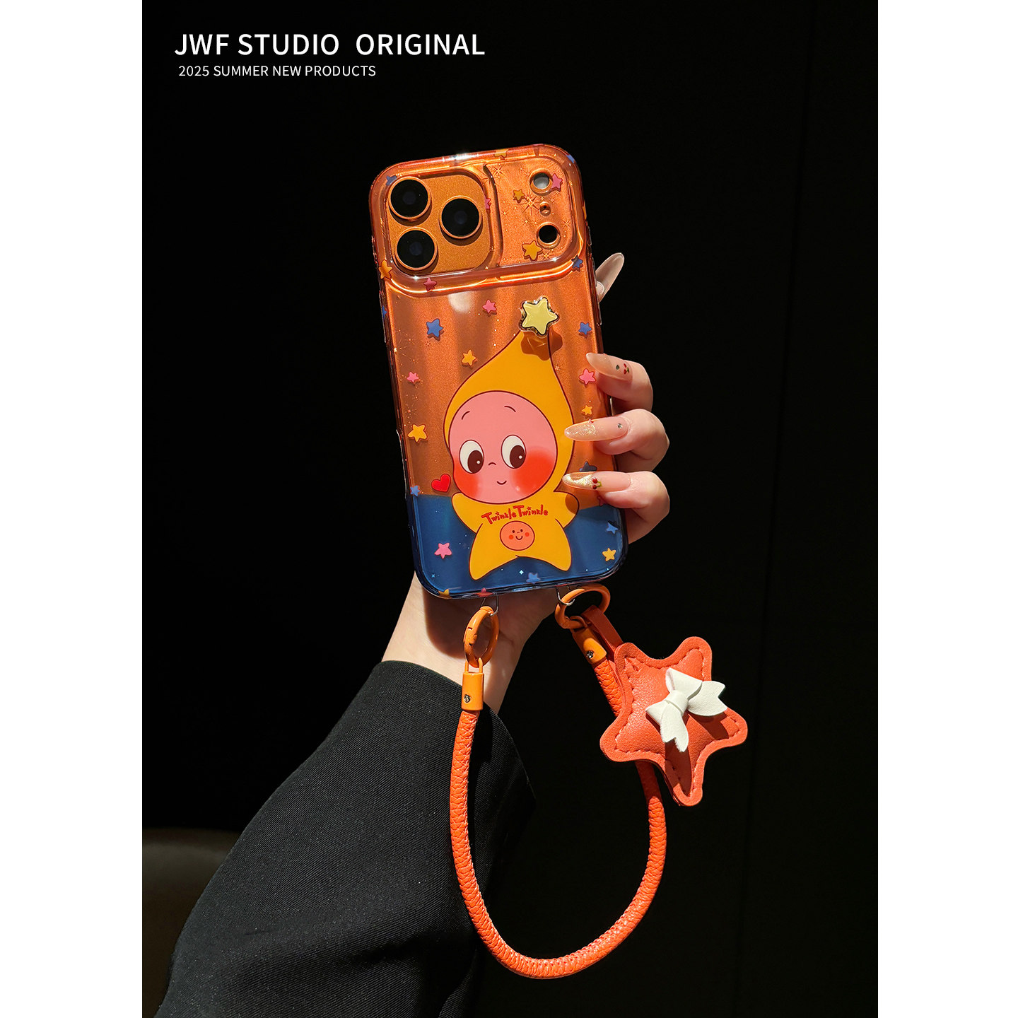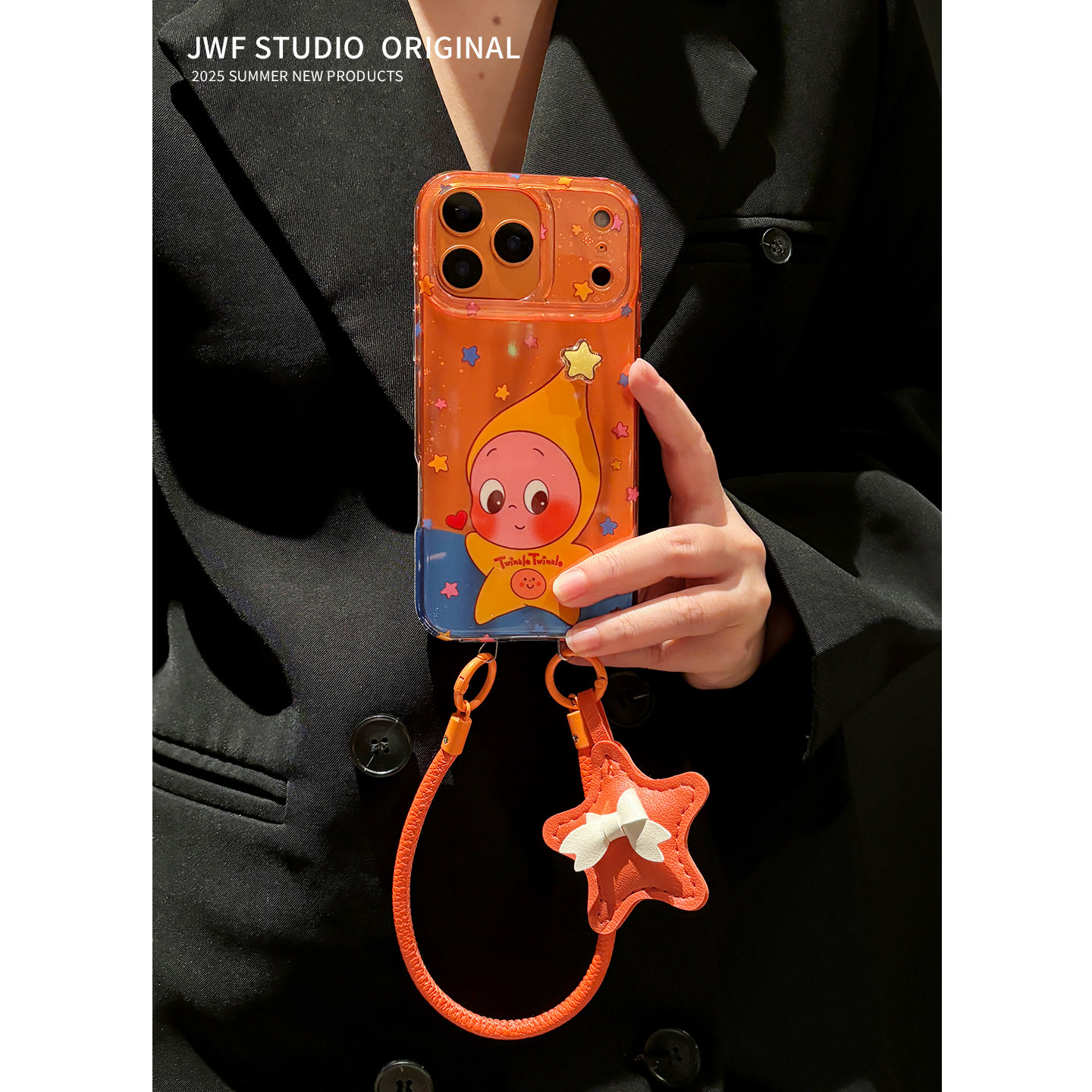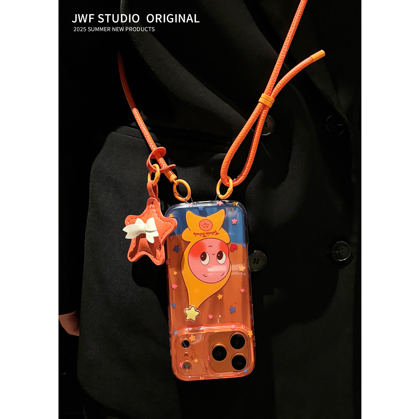 ins风日韩涂鸦橙色星星人可斜挎适用苹果17promax手机壳iphone13挂件新款15pro女14趣味旋转卡通16promax软套