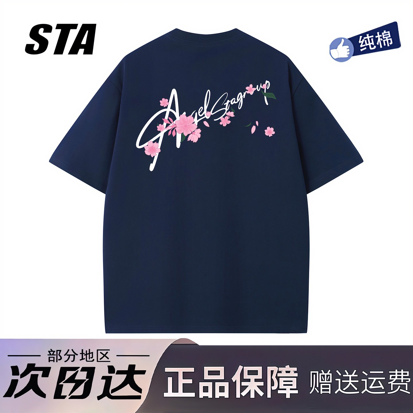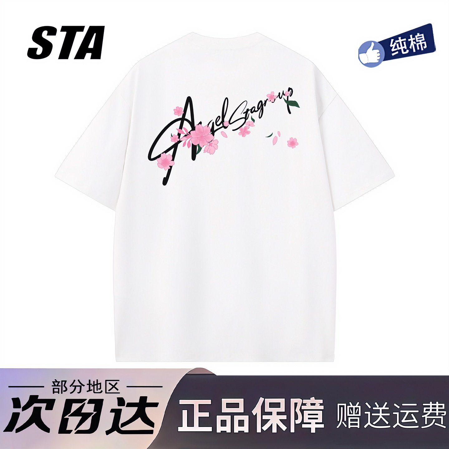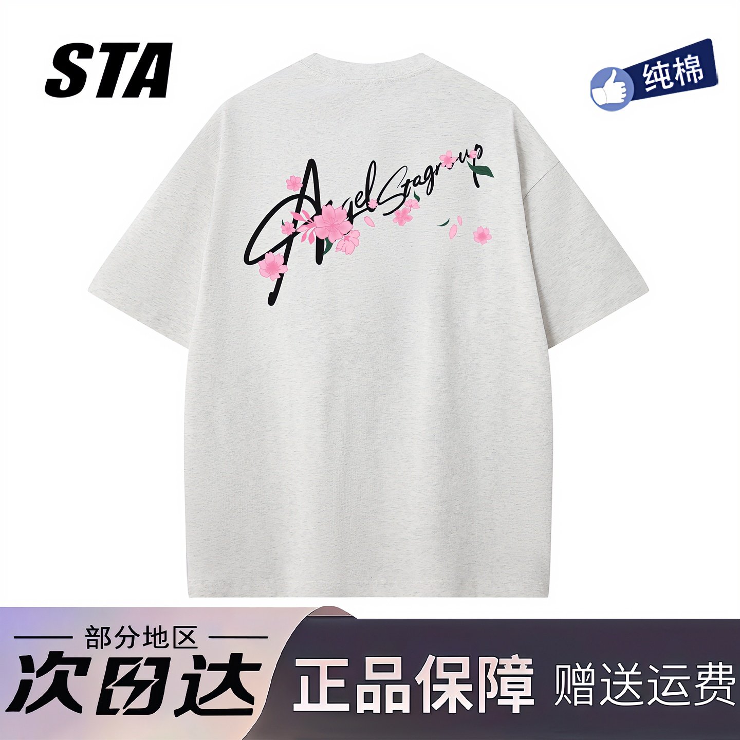 STA旗舰店美式手绘花卉字母印花短袖夏季潮牌复古高街重磅纯棉t恤