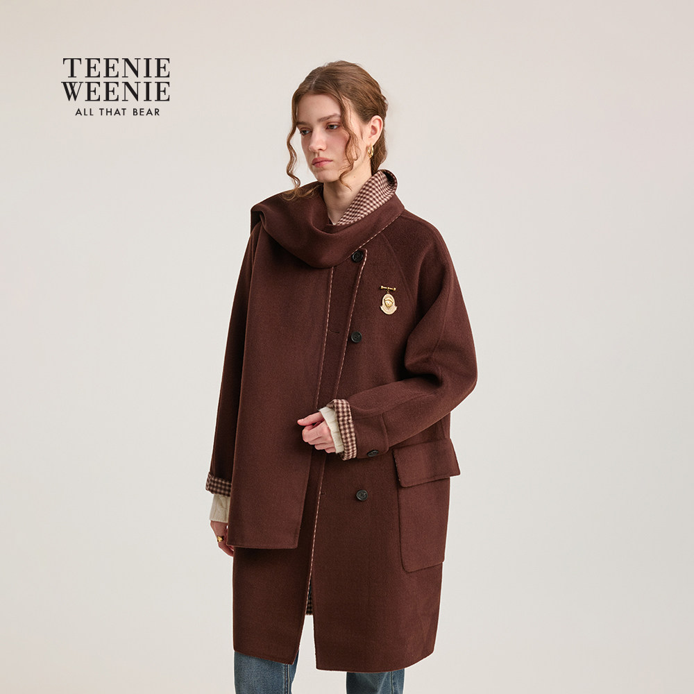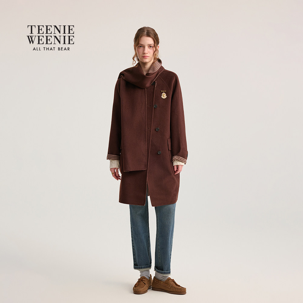 【含绵羊毛】TeenieWeenie小熊女装毛呢外套25年冬季款围巾领大衣