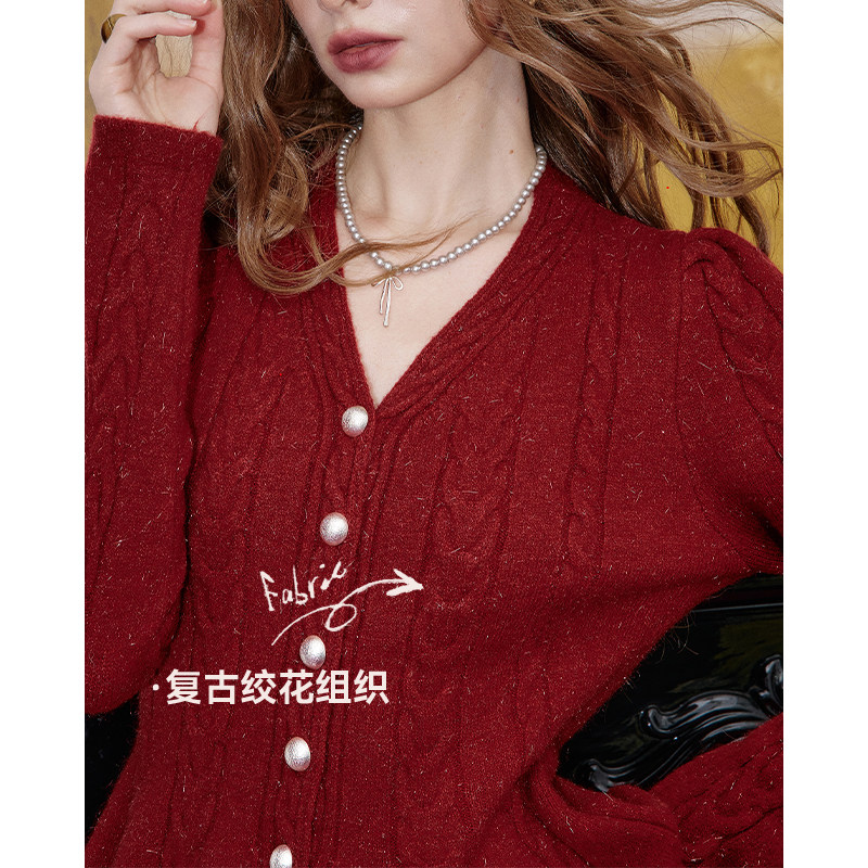 妖精的口袋复古绞花亮闪红色毛衣女2026年春秋款收腰显瘦气质上衣