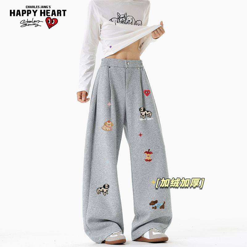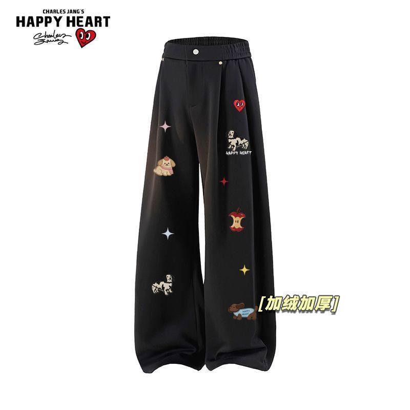查尔斯桃心小狗印花美式加绒加厚休闲裤男女冬季新款直筒长裤子潮