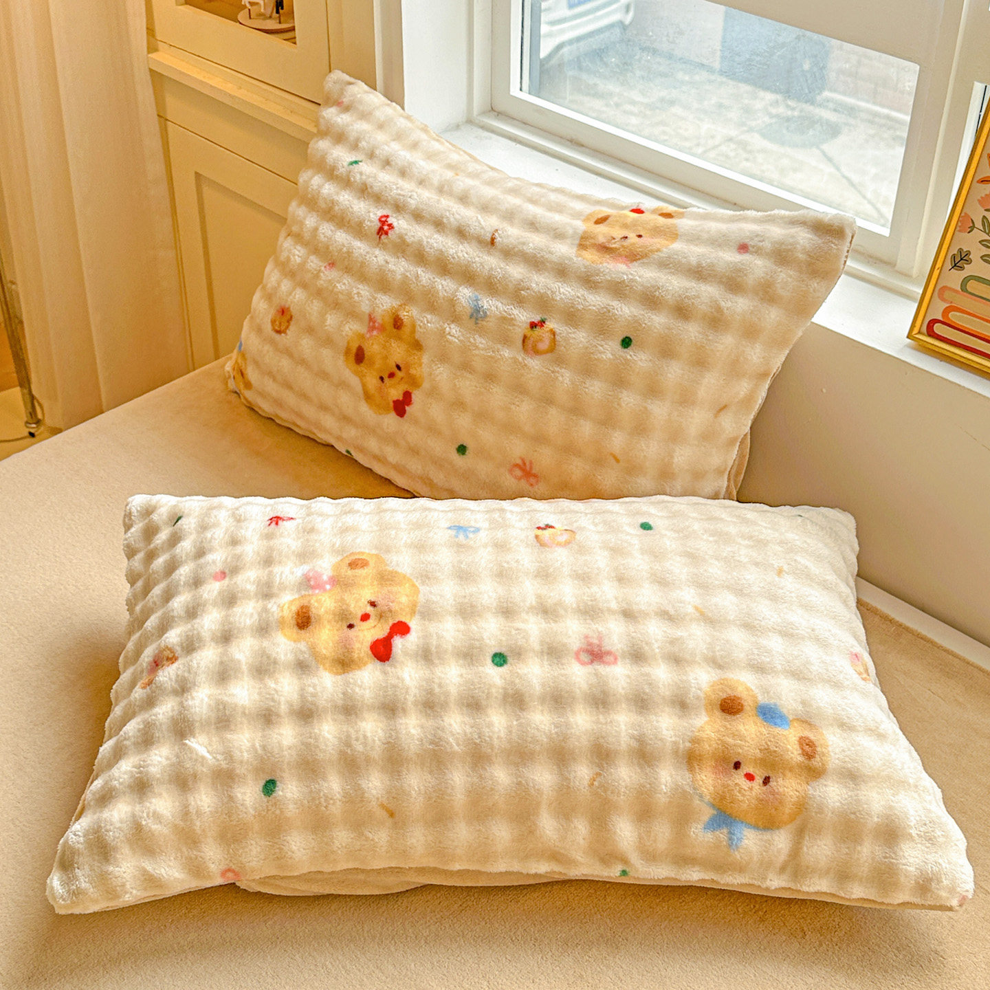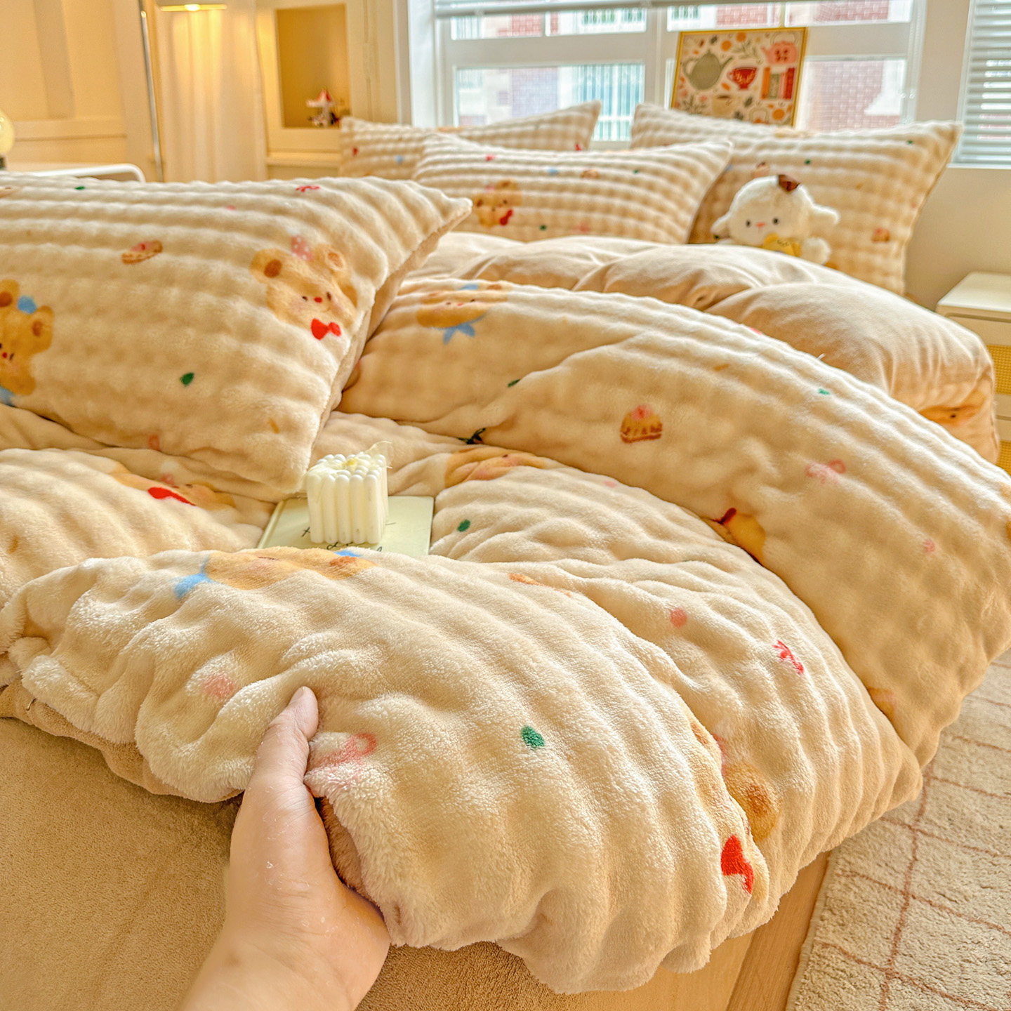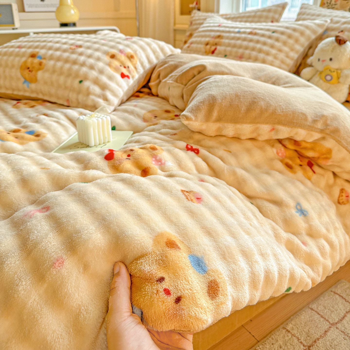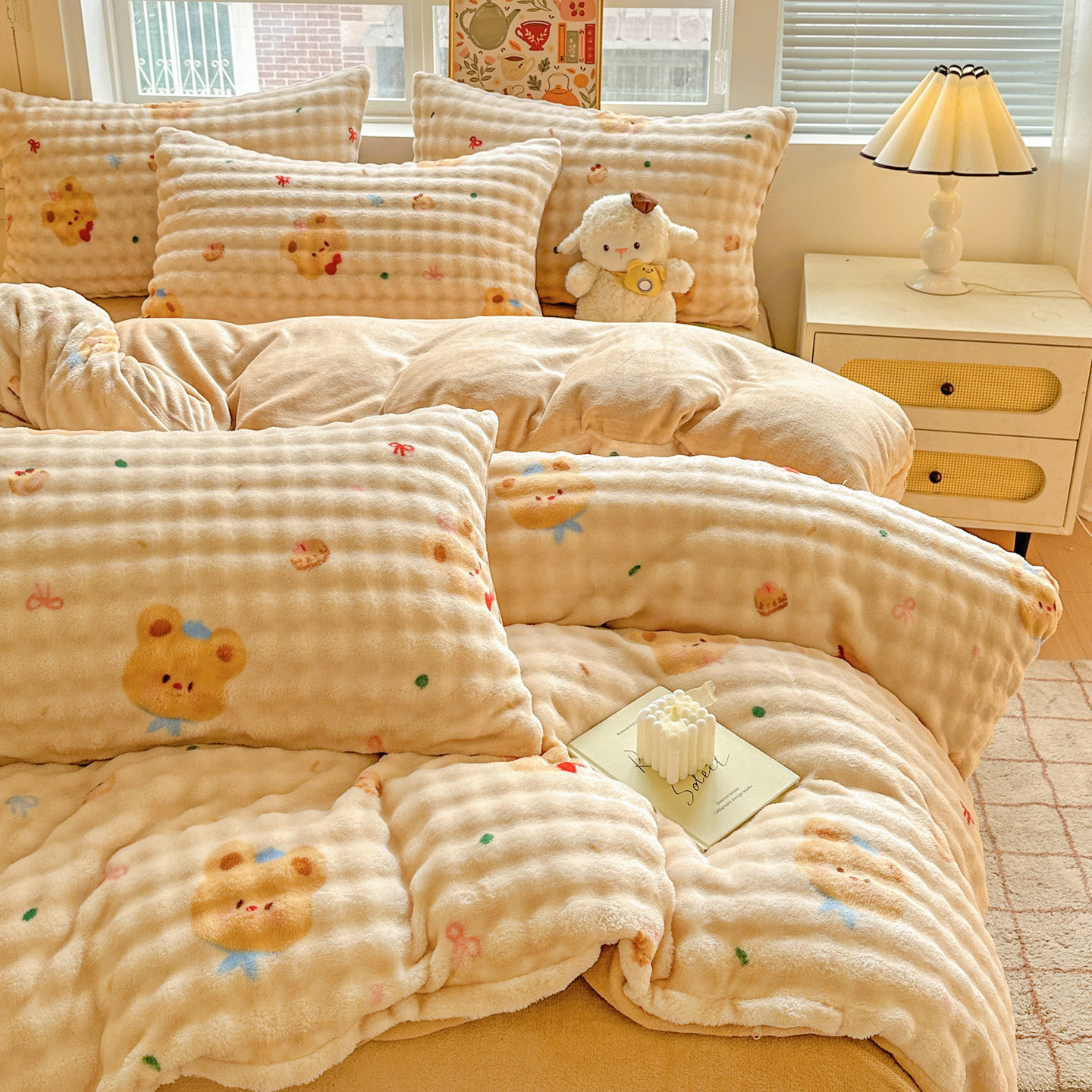 黄油小熊牛奶绒四件套儿童卡通冬季加厚珊瑚绒被套宿舍床单三件套