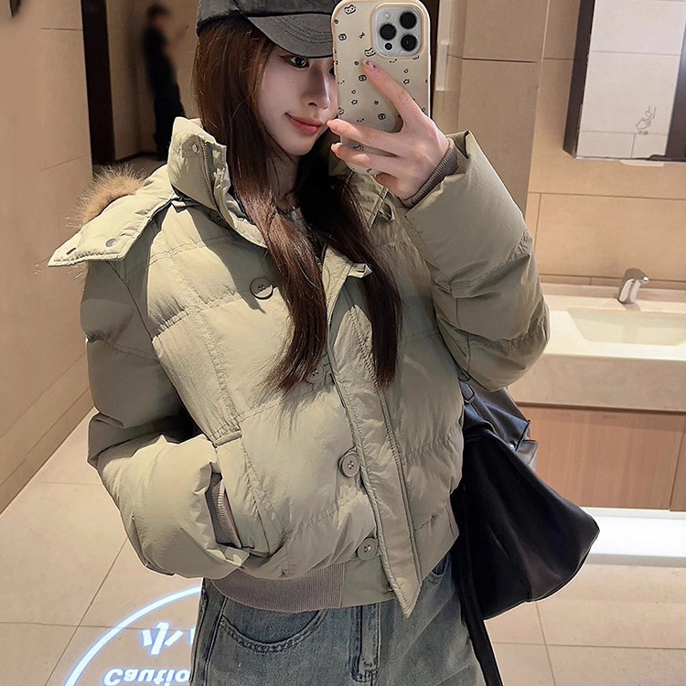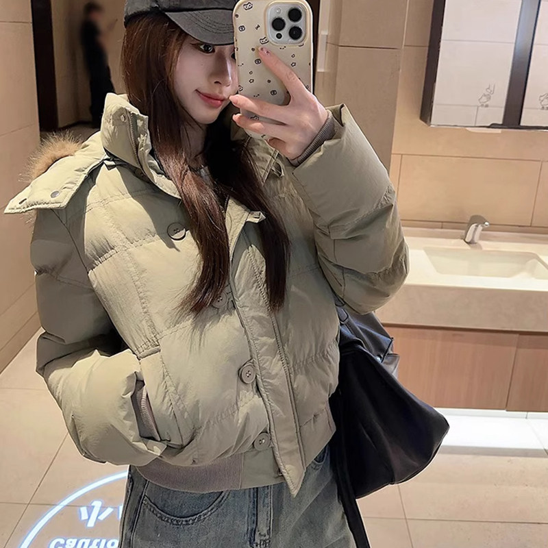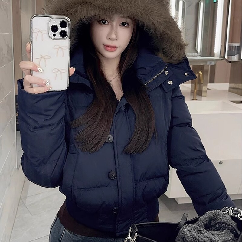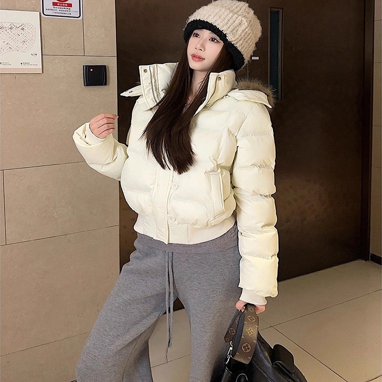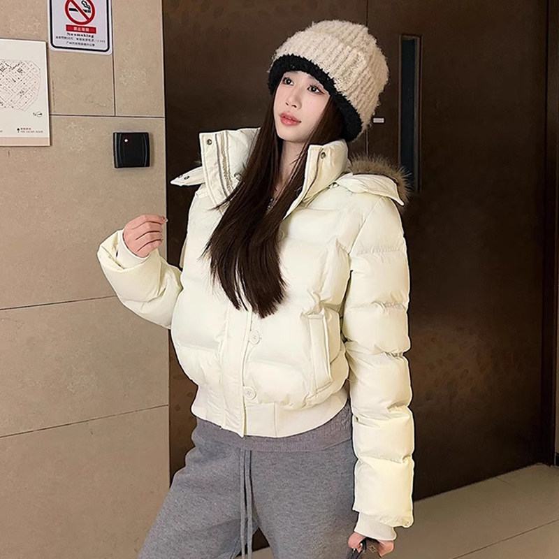 户外2025年冬季新款毛领短款羽绒服女保暖加厚面包服棉服黑色白色