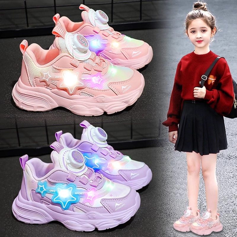 巴布豆女童鞋2026儿童春秋女孩老爹鞋发光鞋旋转扣运动鞋鞋子粉色