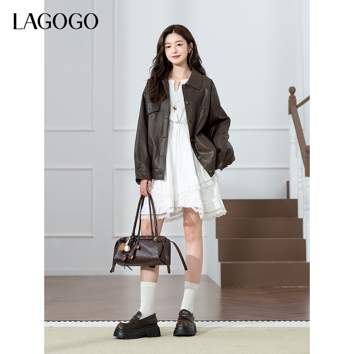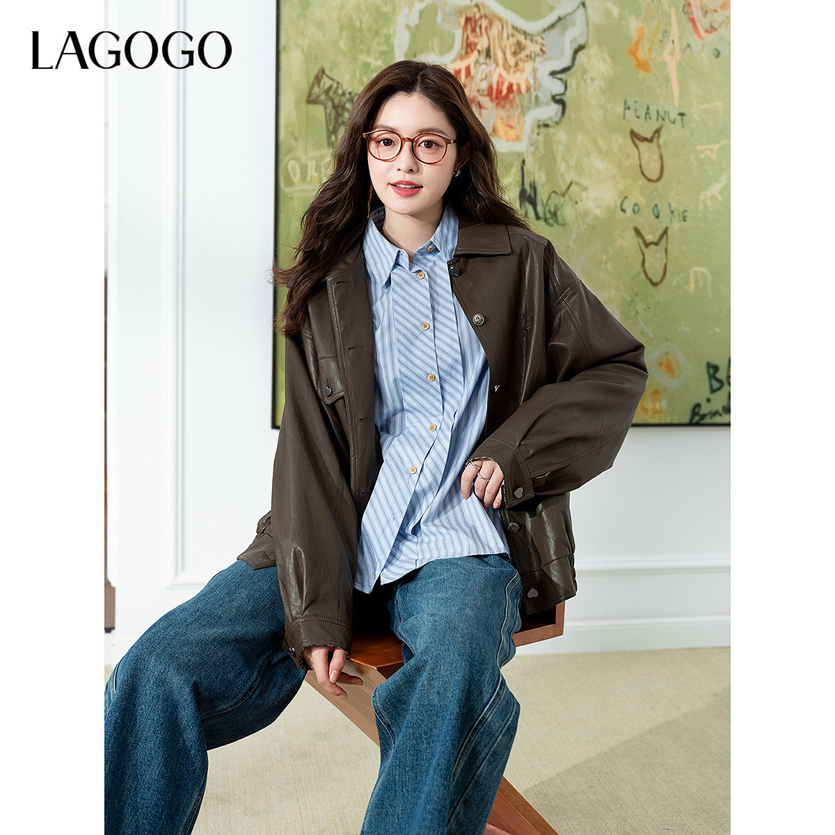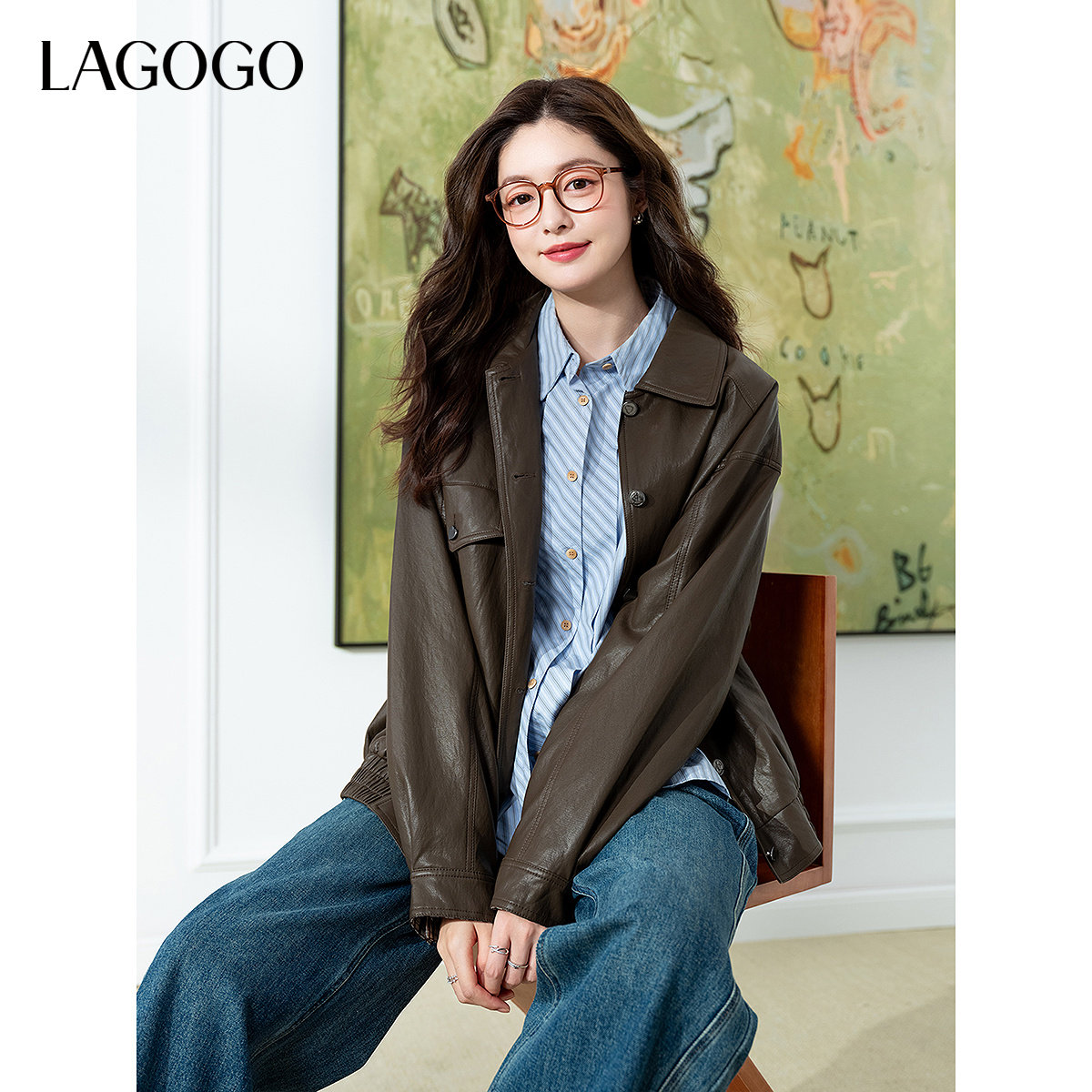 LAGOGO巴恩风琥珀流光PU外套女拉谷谷2026春新款蛋白皮夹克